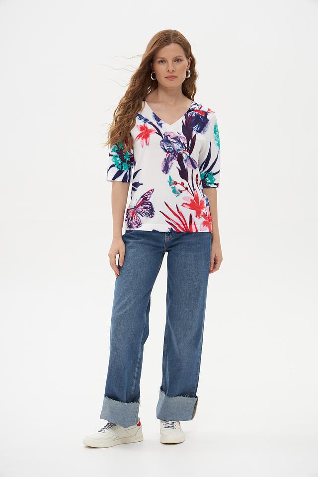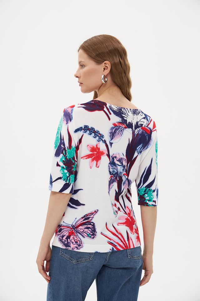 Модель имеет прямой крой, короткие рукава и V-образный вырез горловины. Главная особенность пуловера – яркий и красочный цветочный принт, включающий в себя изображения цветов и бабочек.