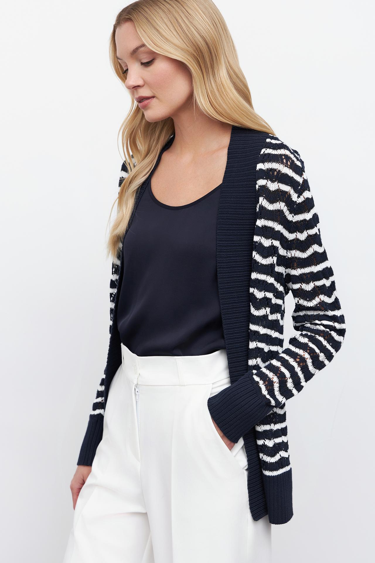 Классический женский жакет Pezzo выполнен из высококачественного хлопка с добавлением полиэстера, обеспечивая комфорт и долговечность. Модель с открытым передом и контрастным полосатым узором в сине-белой гамме станет незаменимым элементом вашего гардероба. Этот стильный кардиган идеально подходит для создания повседневных или элегантных образов, легко сочетается с различной одеждой.