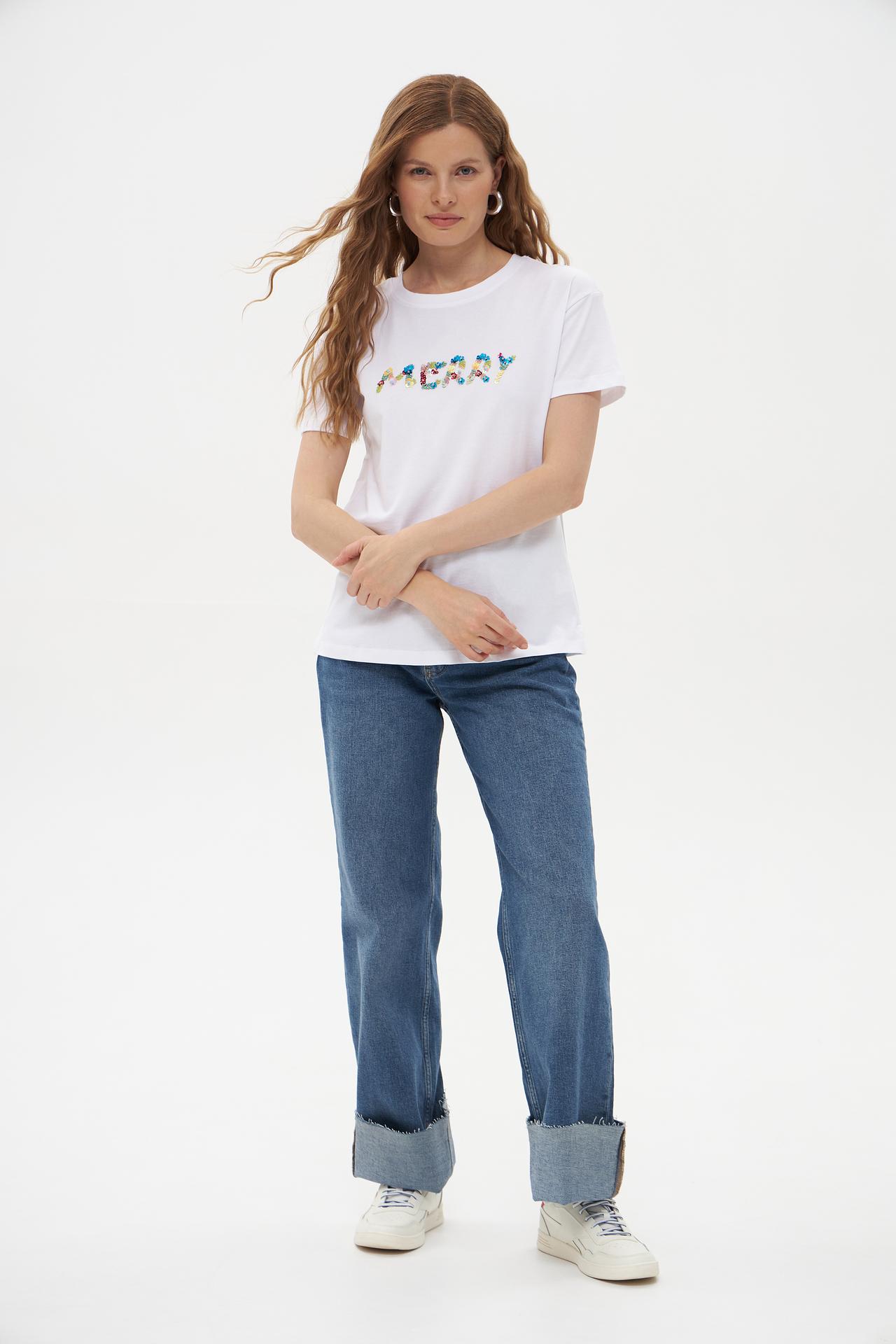 - Оригинальный дизайн. Футболка украшена вышивкой с надписью MERRY, добавляя образу игривости и индивидуальности.