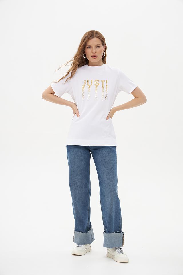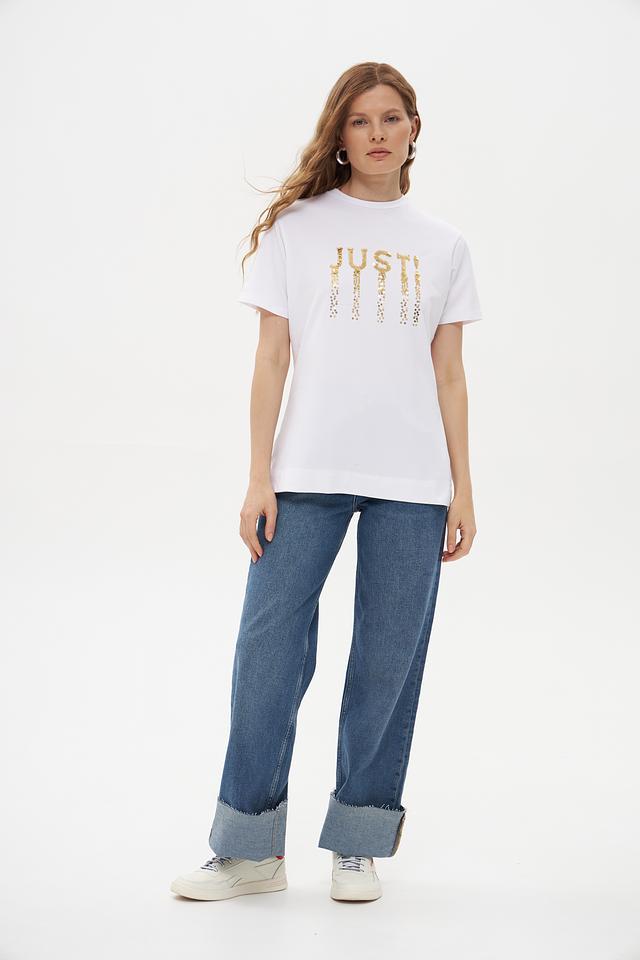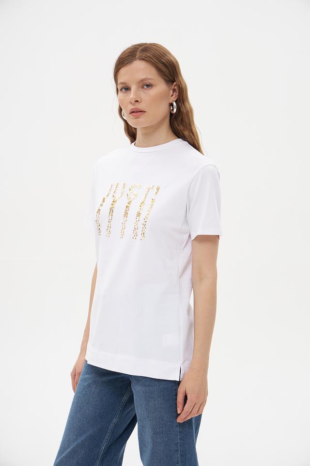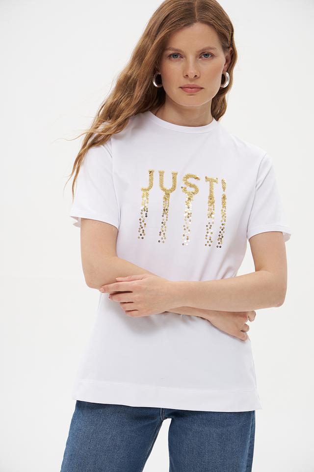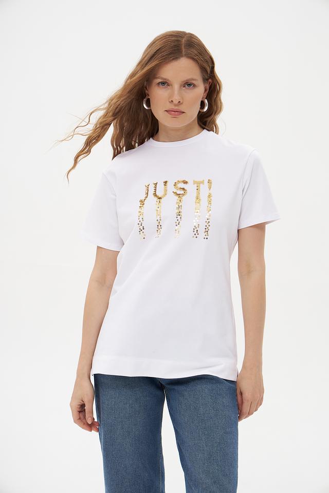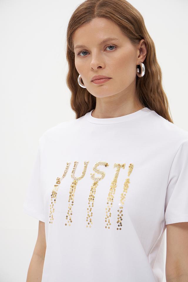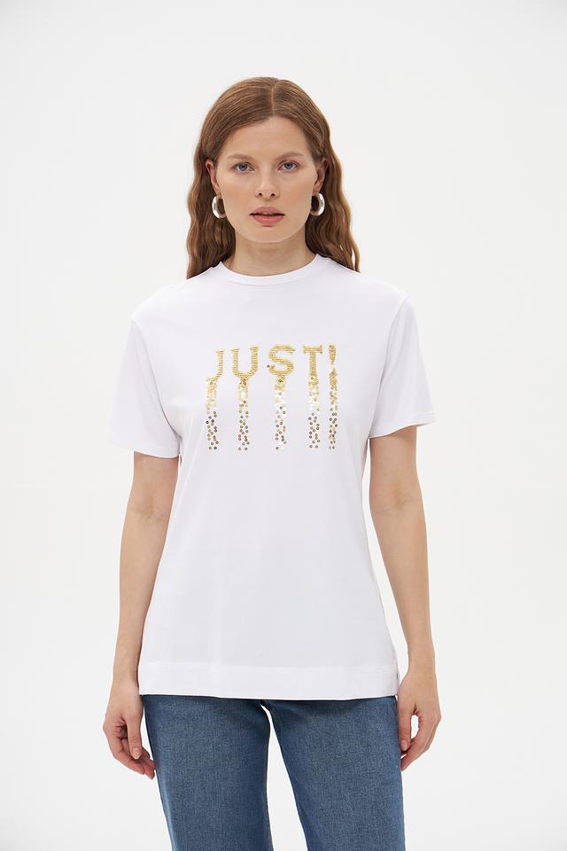 Основной цвет футболки – белый, что делает ее универсальной и легко сочетаемой с другими элементами одежды. Главная особенность модели – эффектная надпись "JUST", выполненная из золотистых пайеток, которая придает образу изысканность и блеск.