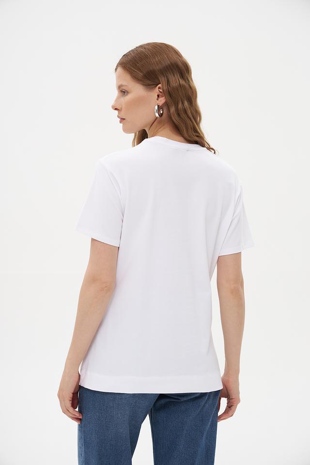 Футболка имеет классический прямой крой и круглый вырез горловины. Она идеально подходит для повседневной носки, а также для создания более ярких и запоминающихся образов. Состав: 95% хлопок, 5% эластан.