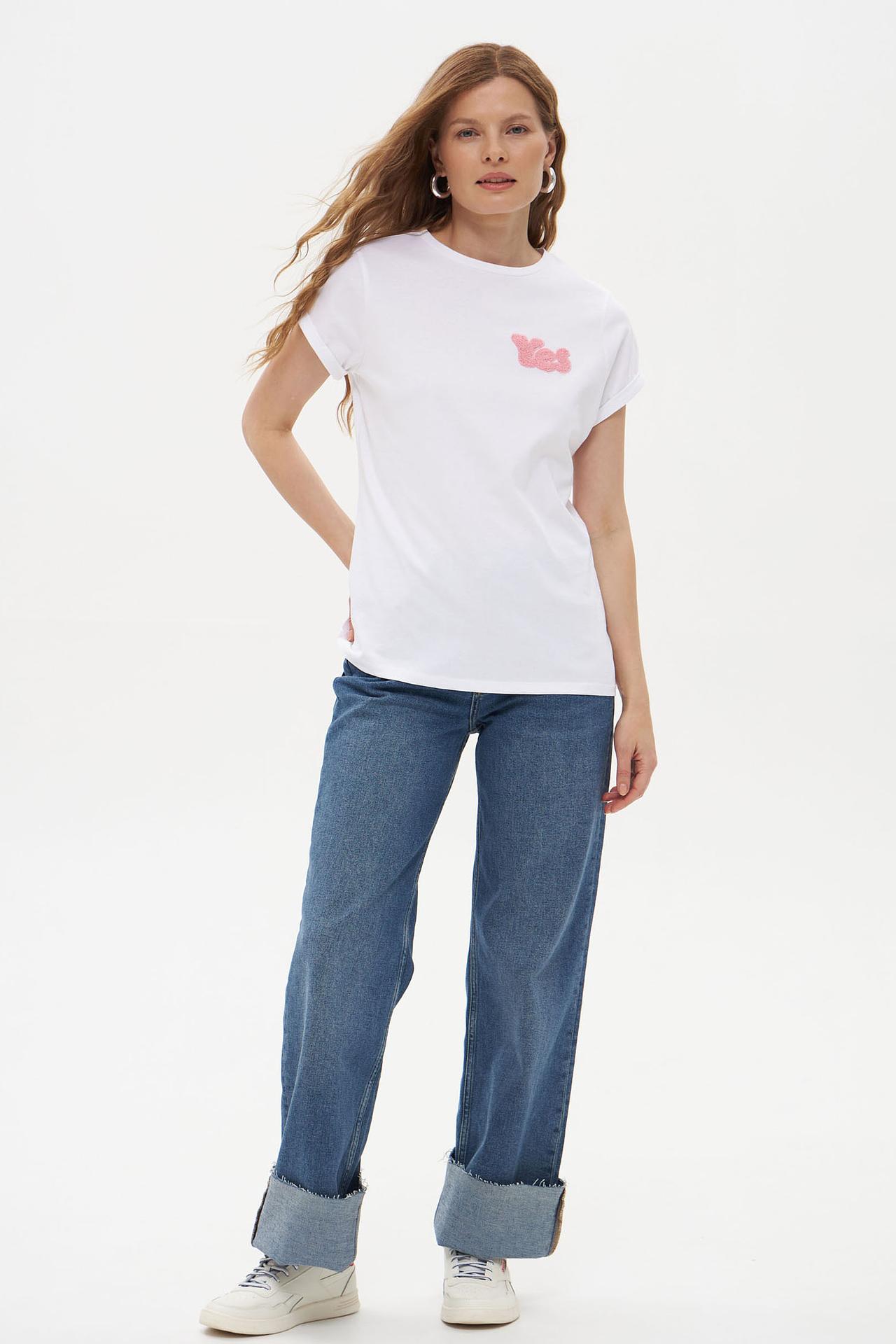 Футболка Pezzo – это классический крой и безупречный комфорт в каждом движении. Изготовленная из 100% хлопка, эта футболка идеально подходит для повседневной носки, обеспечивая мягкость и превосходную воздухопроницаемость. Белый цвет футболки является универсальным и легко сочетается с любым гардеробом, а розовая надпись добавляет нежный акцент.
