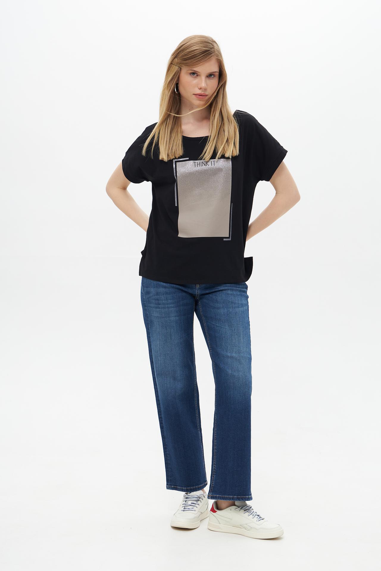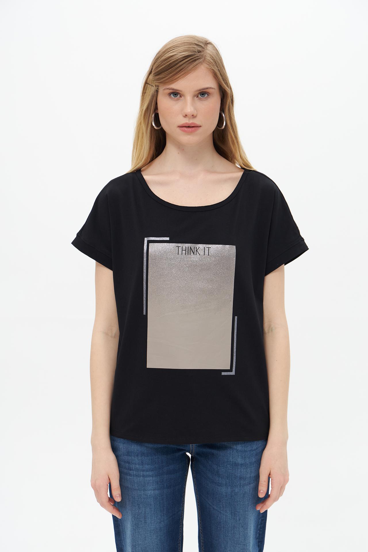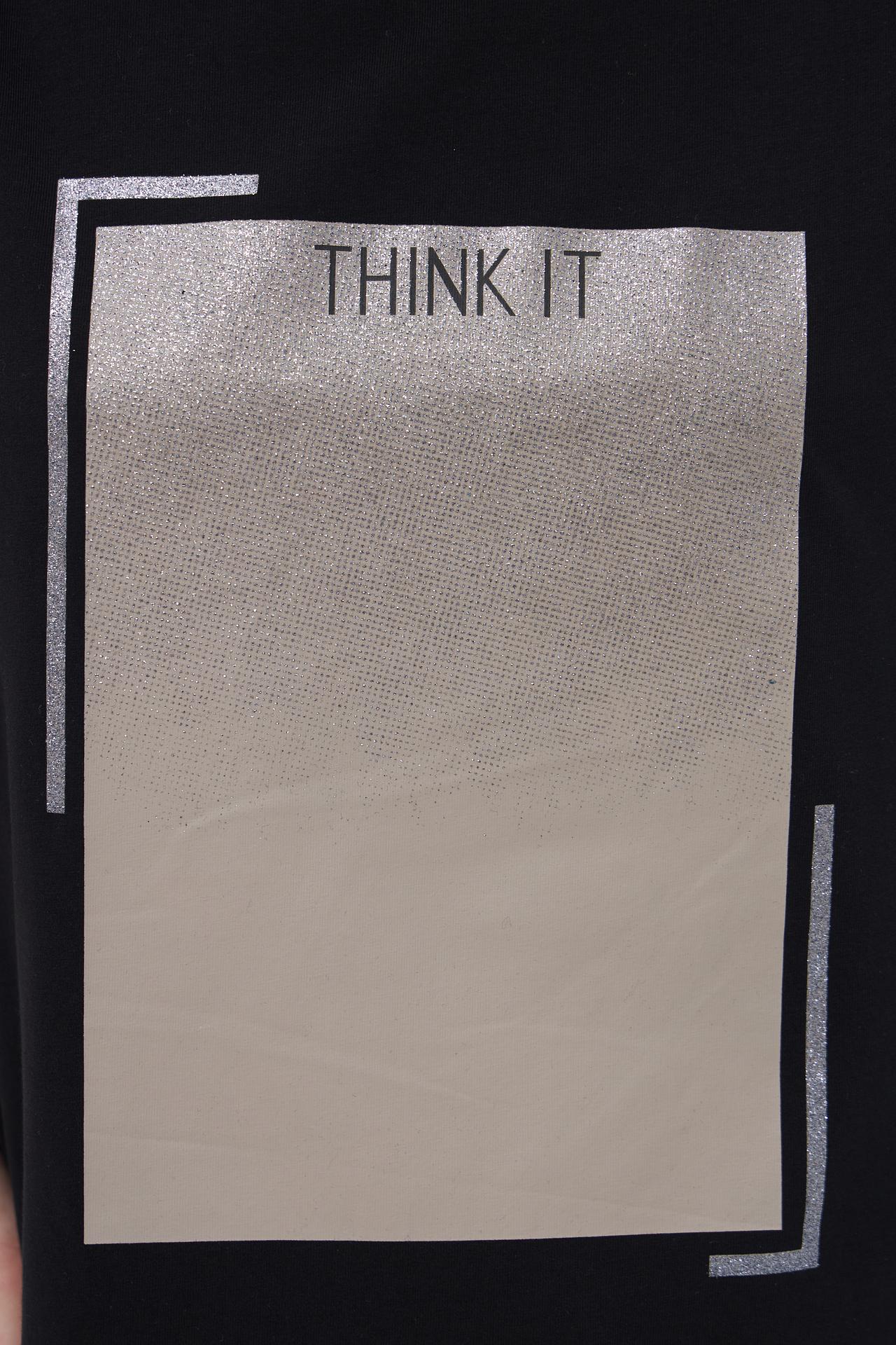 - Дизайн: Классический черный цвет футболки дополнен современным серебристым принтом с надписью "THINK IT", создавая элегантный и актуальный вид.