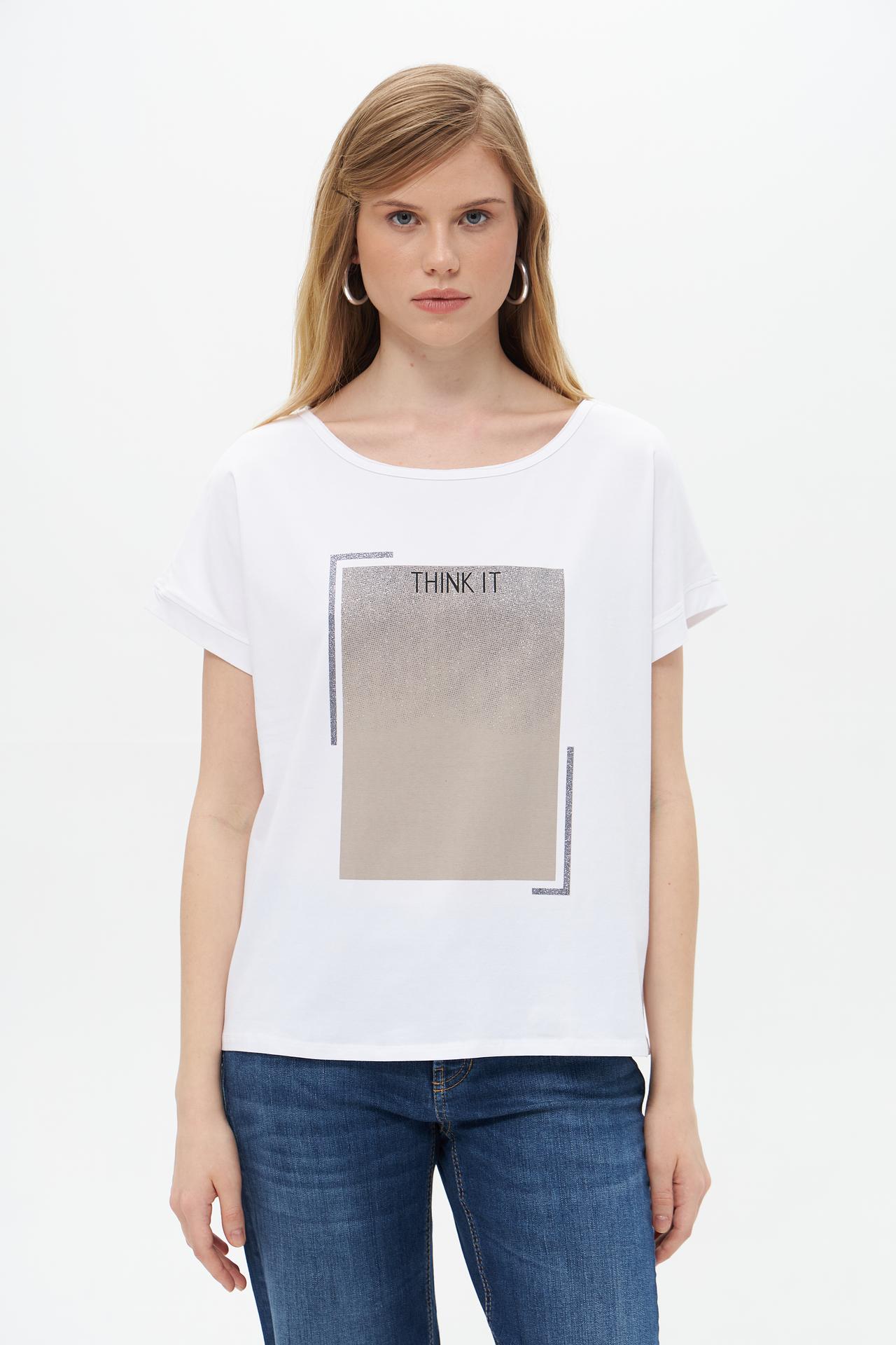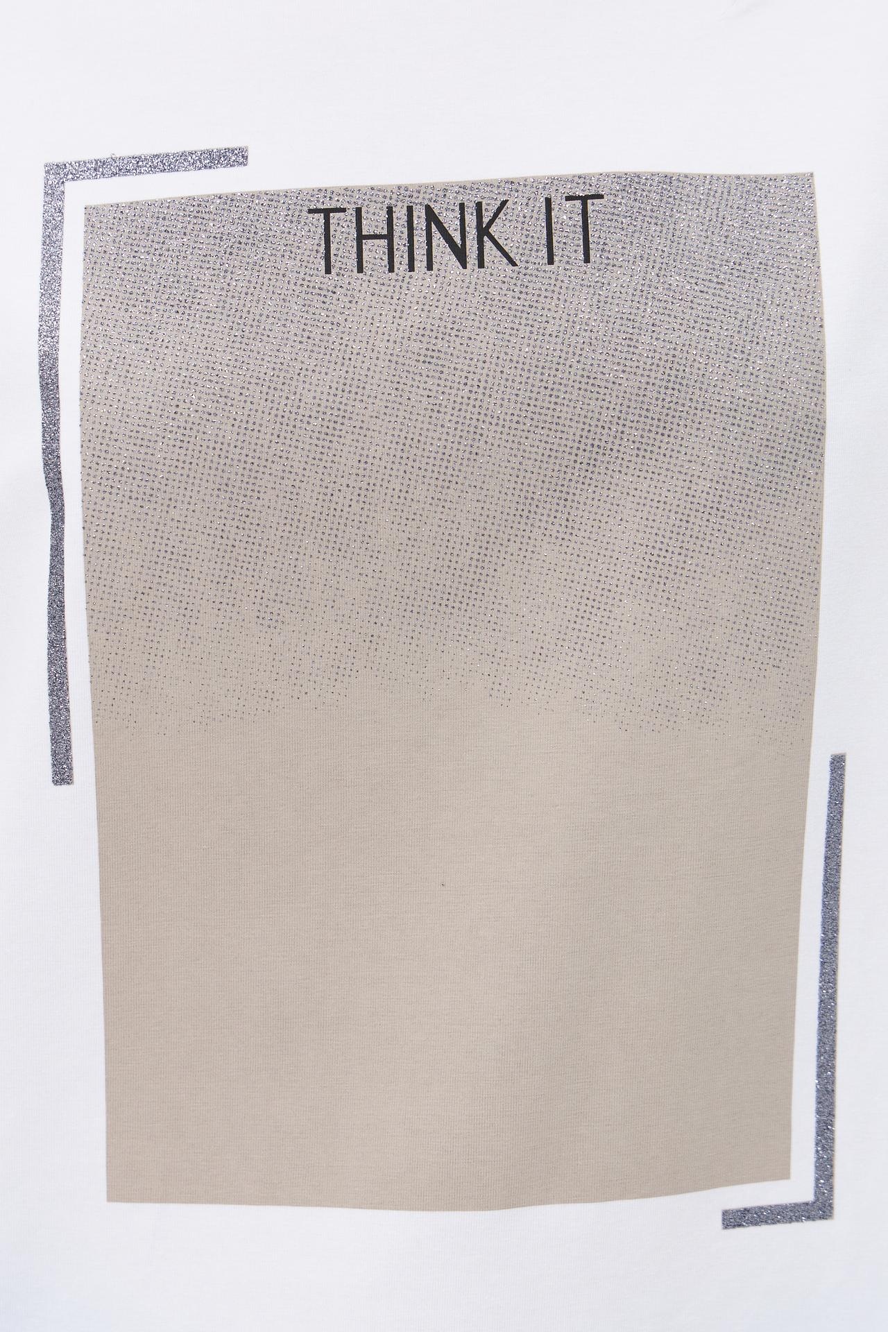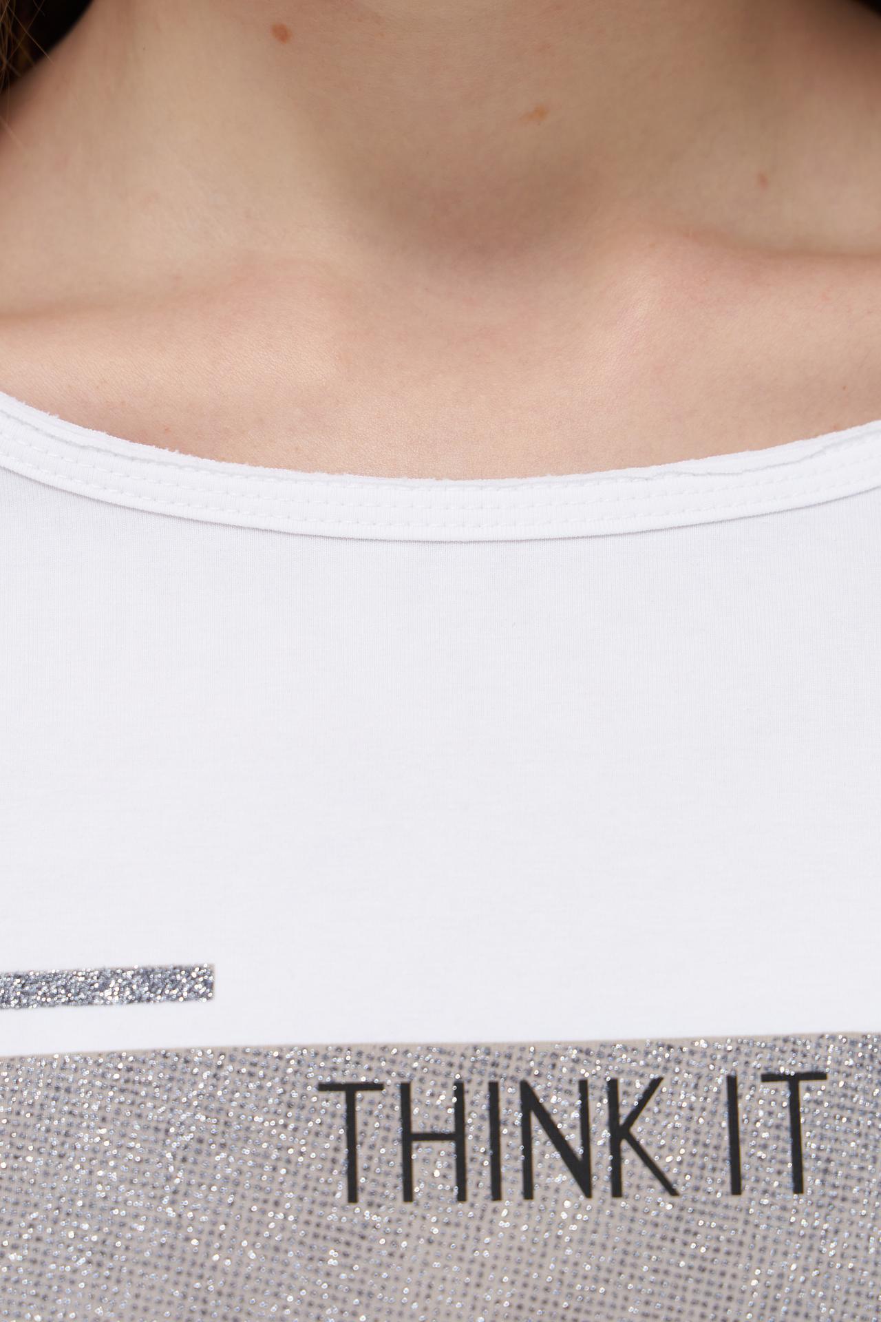 Футболка белого цвета украшена эффектным принтом с блестками, который добавляет образу изюминку и делает его уникальным. Прямой крой позволяет носить её как в повседневной жизни, так и на вечеринке.