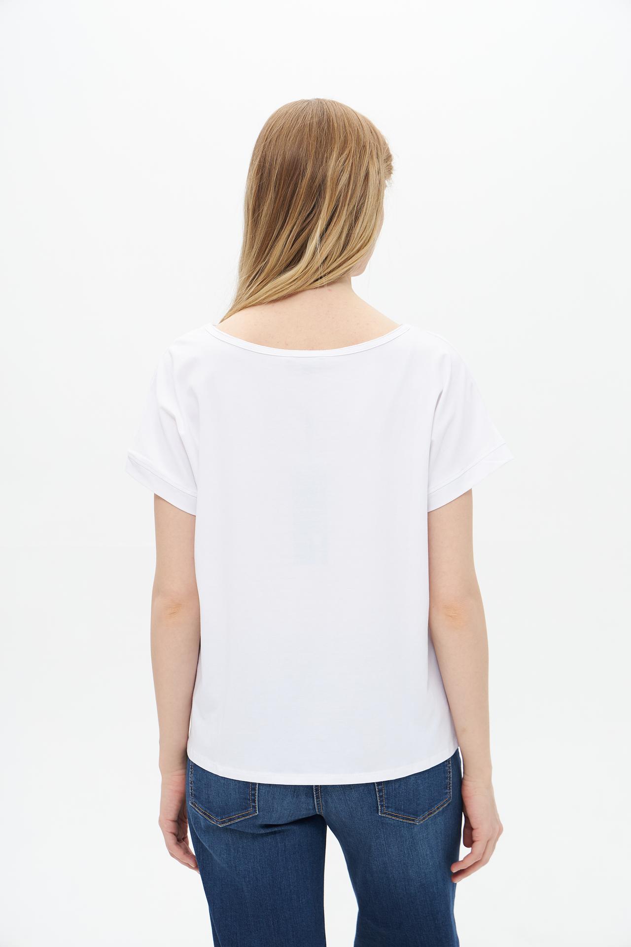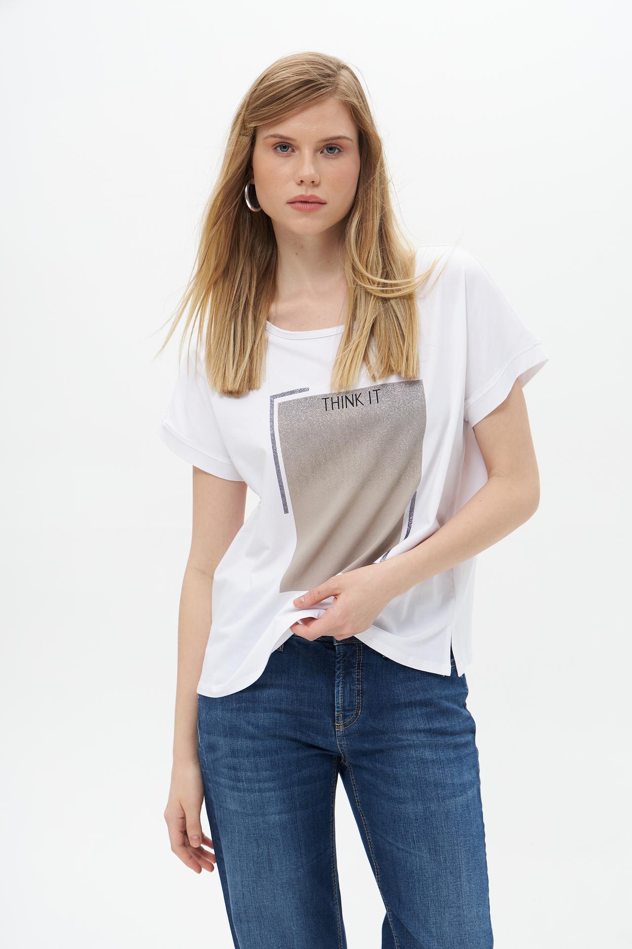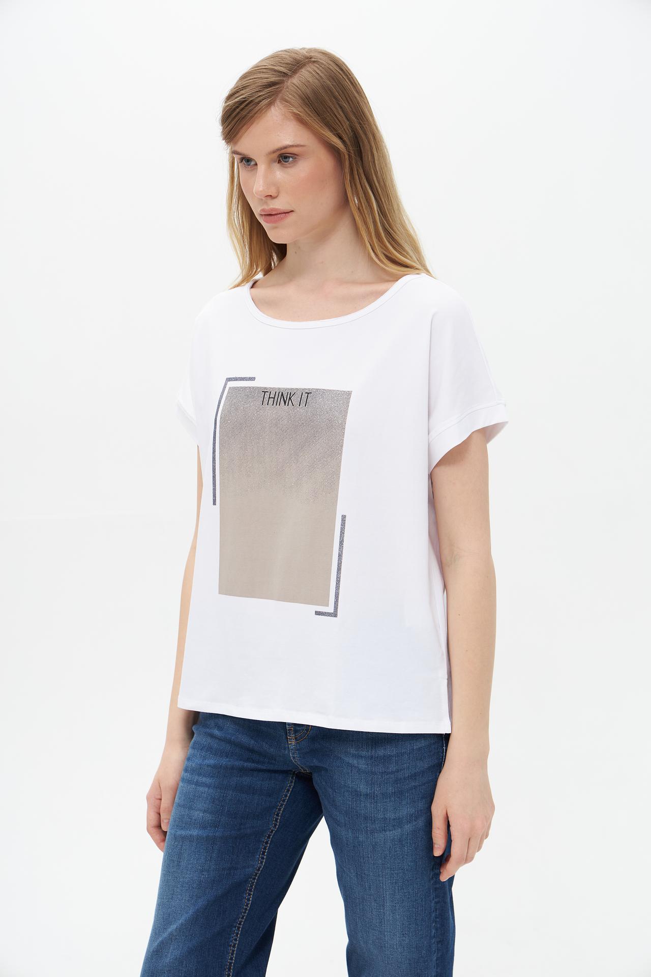 Футболка белого цвета украшена эффектным принтом с блестками, который добавляет образу изюминку и делает его уникальным. Прямой крой позволяет носить её как в повседневной жизни, так и на вечеринке.