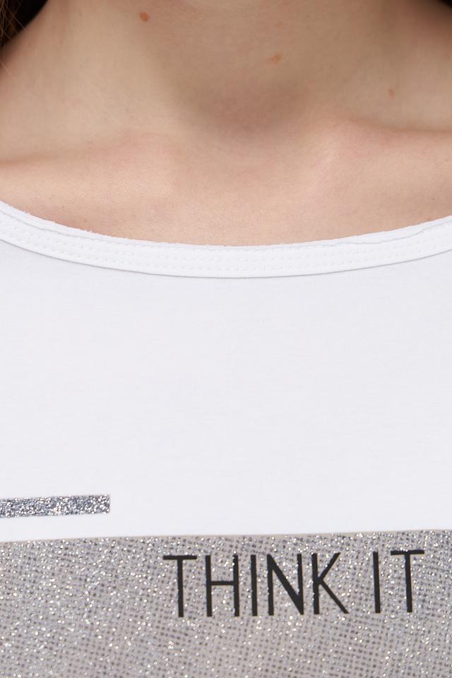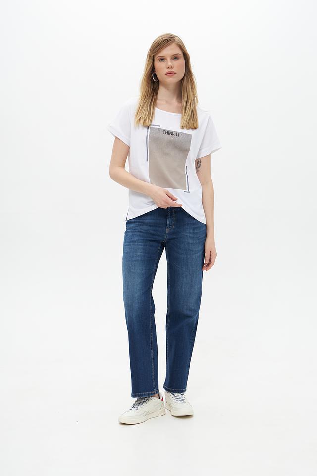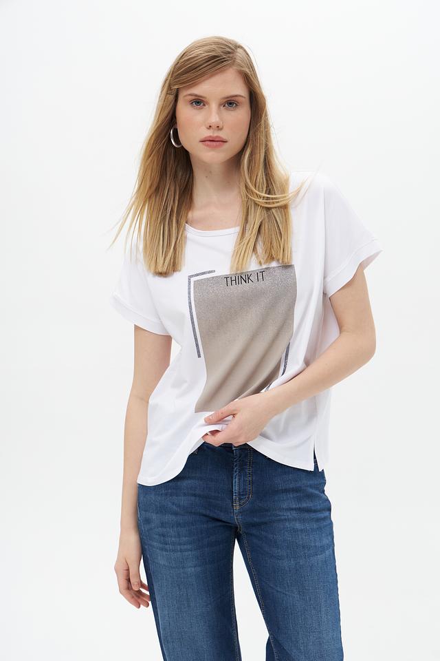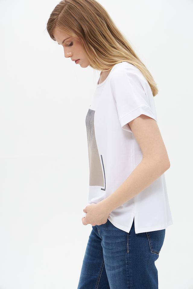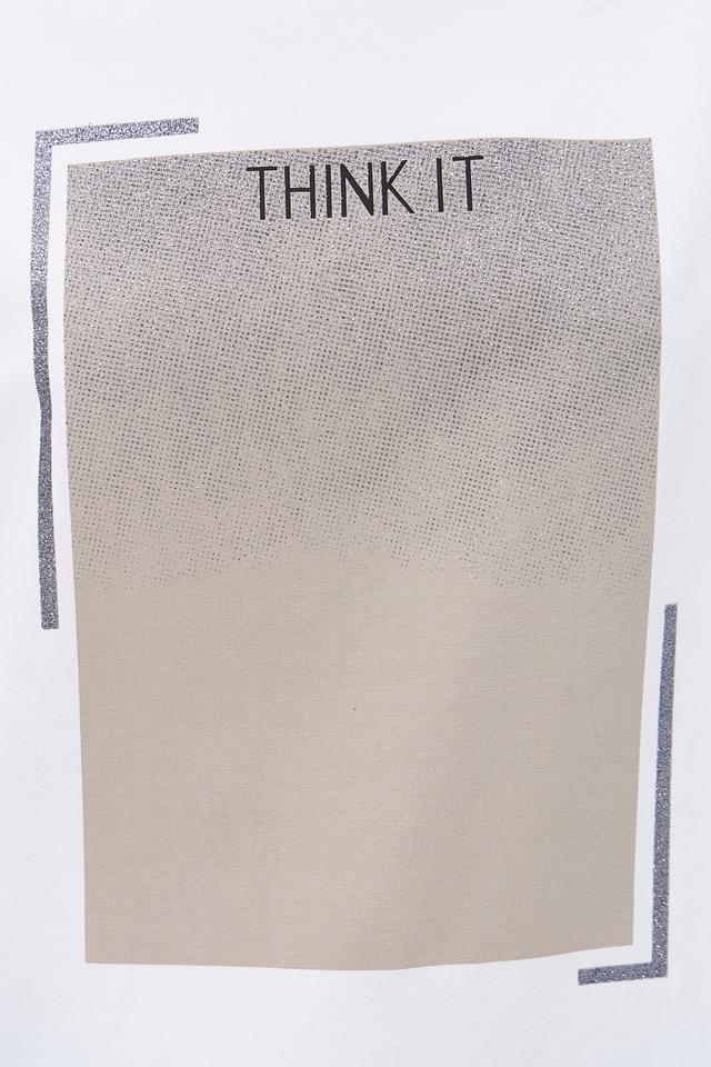 Основной цвет футболки – белый, что делает ее универсальной и легко сочетаемой с другими элементами одежды. На передней части изделия расположен оригинальный графичный принт в бежево-серых тонах, который добавляет образу индивидуальности.