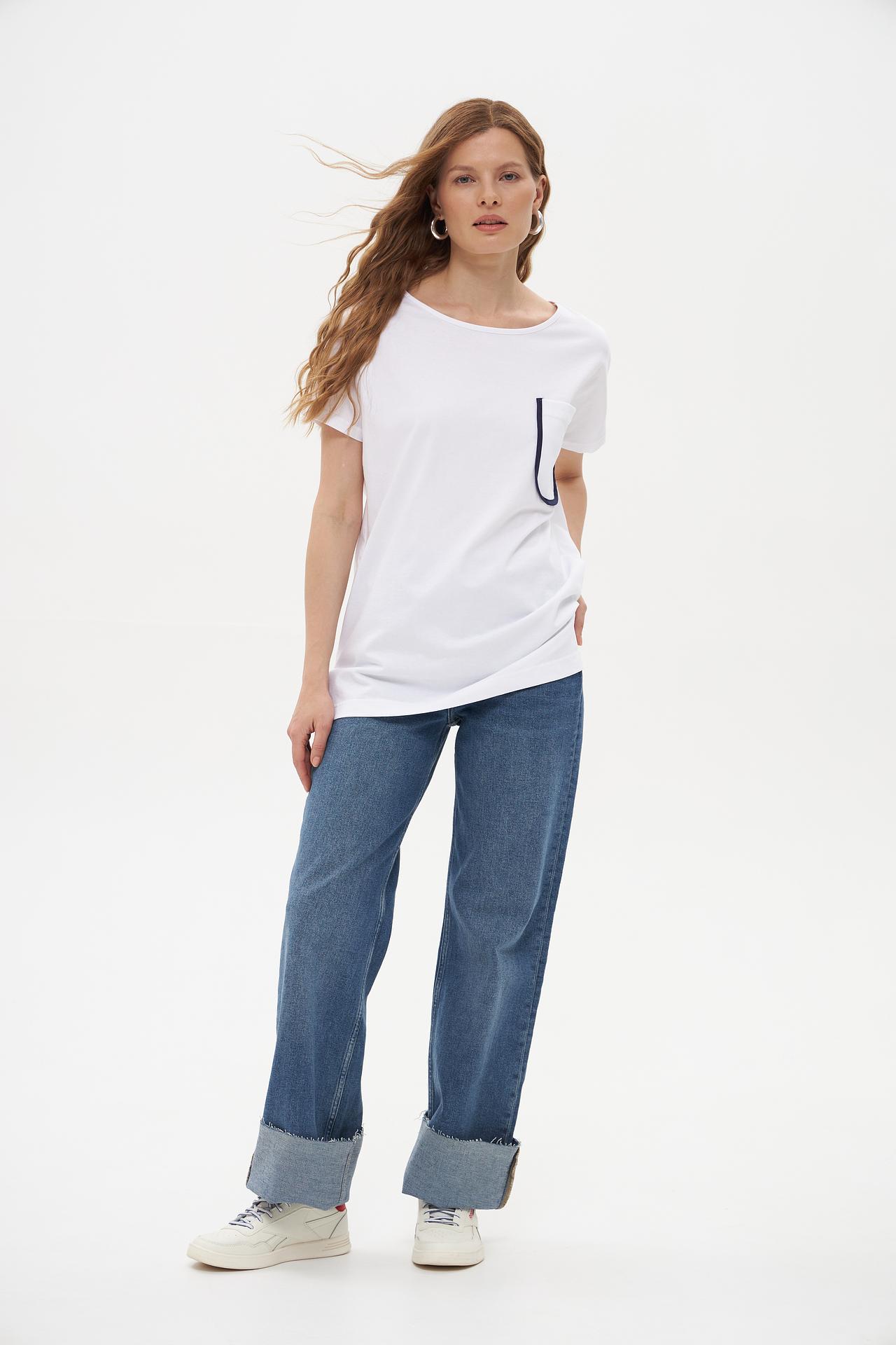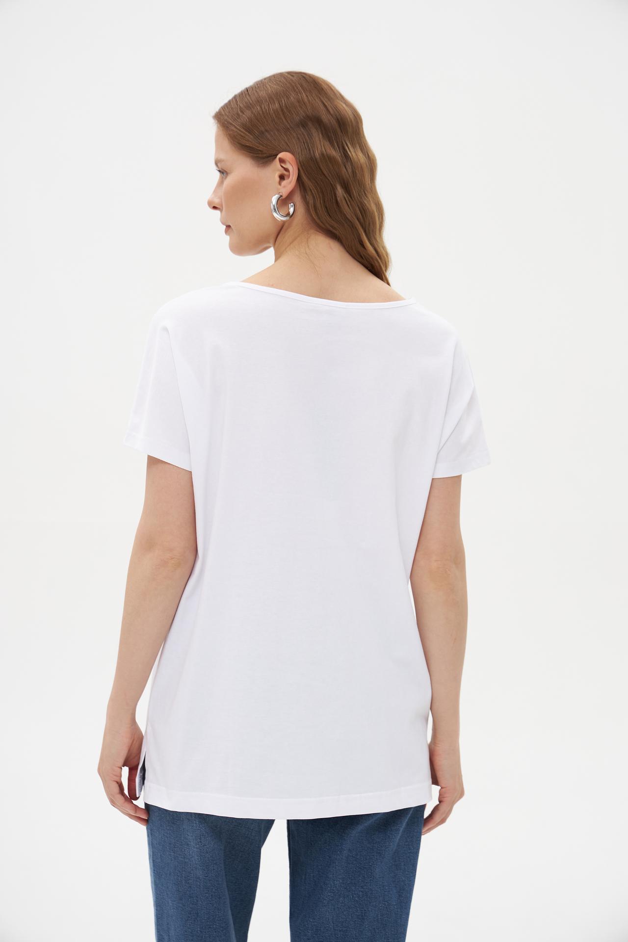 Футболка отличается высоким качеством пошива и приятной на ощупь текстурой натуральной ткани. Она не мнется и хорошо держит форму после стирки, что делает ее удобной и долговечной вещью в вашем гардеробе. Универсальный белый цвет легко сочетается с любыми элементами одежды.