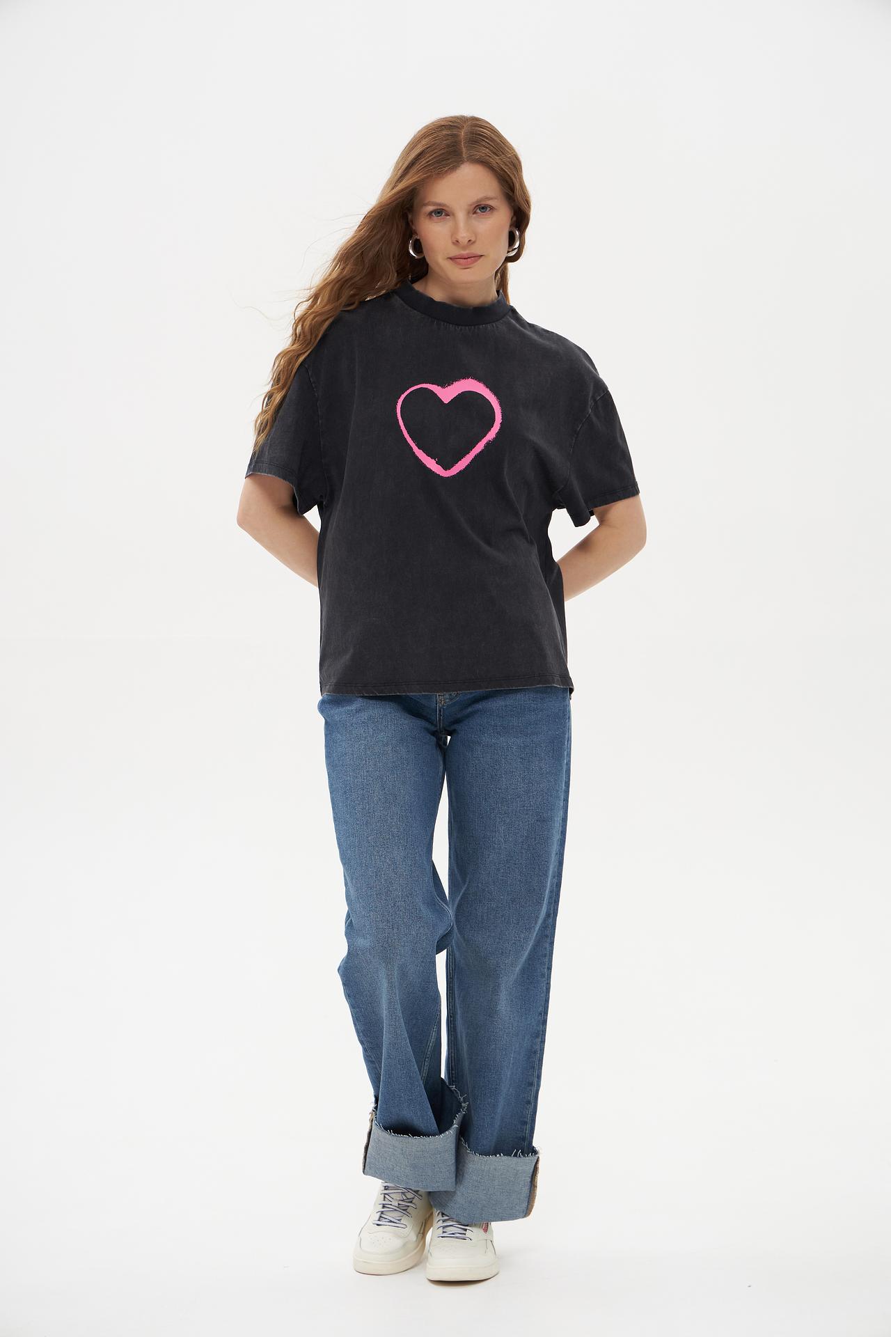 - Дизайн: Прямой крой и классический круглый вырез делают эту футболку подходящей для любого типа фигуры. Яркий, но не кричащий принт в виде сердца добавляет образу индивидуальности и романтичности.