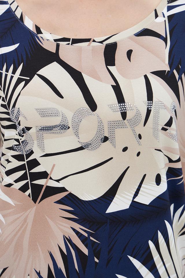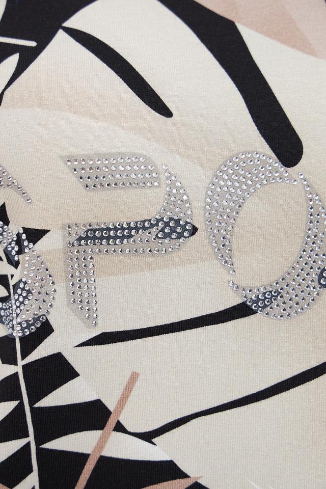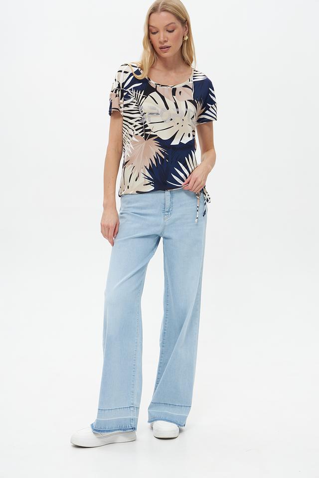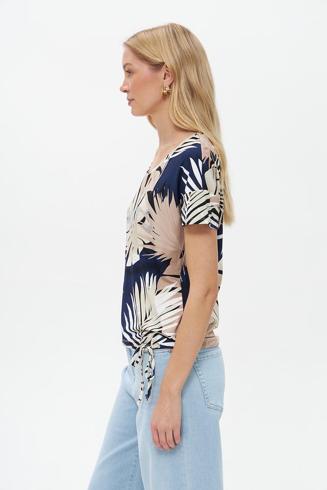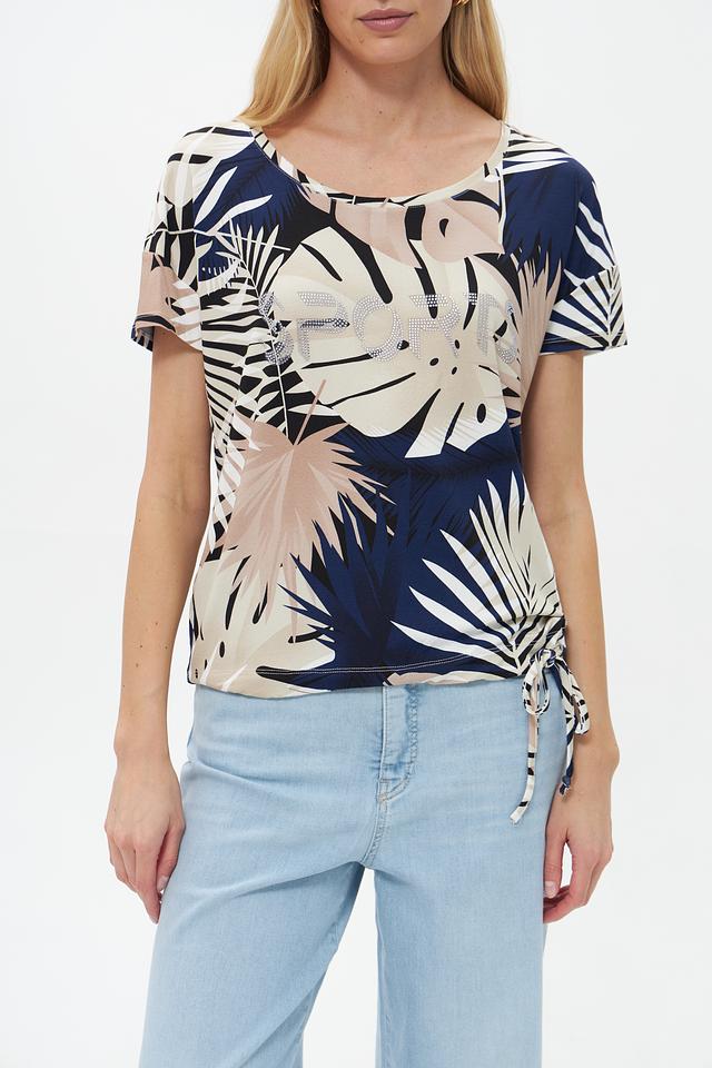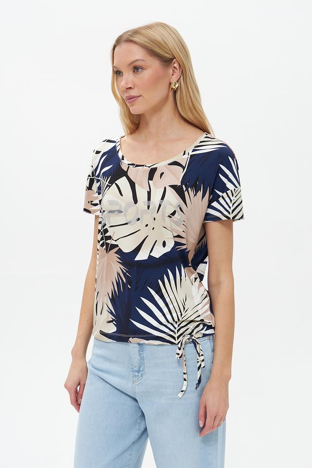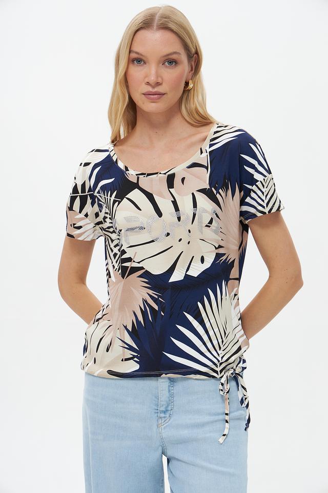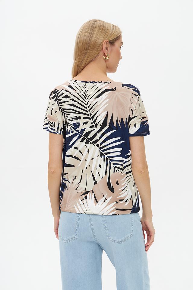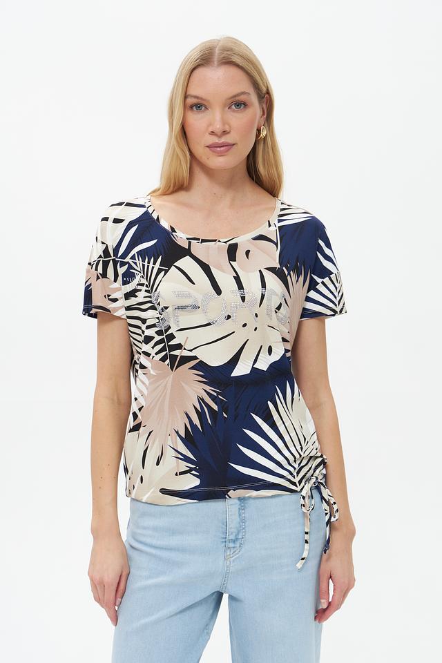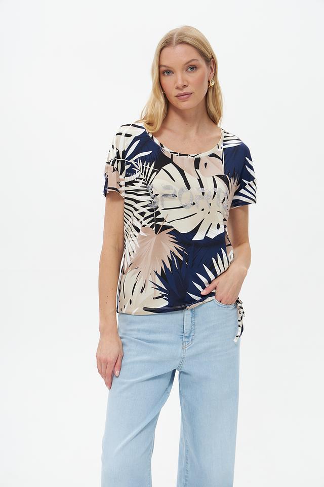 Женская футболка Pezzo бежевого цвета с ярким тропическим принтом и завязками по бокам. Изготовлена из мягкой вискозы с добавлением эластана для комфорта и свободы движений. Состав: вискоза 95%, эластан 5%
