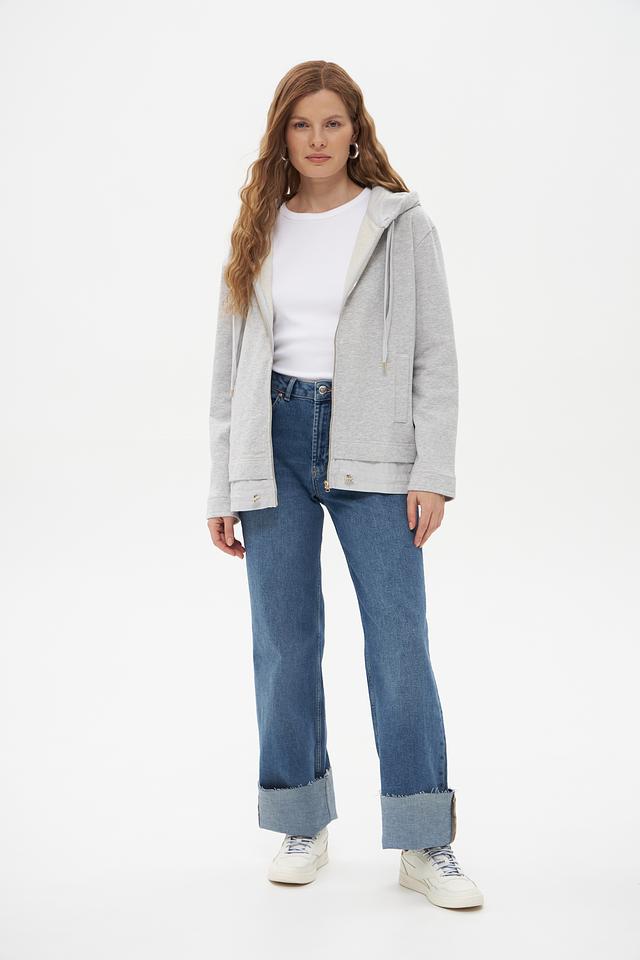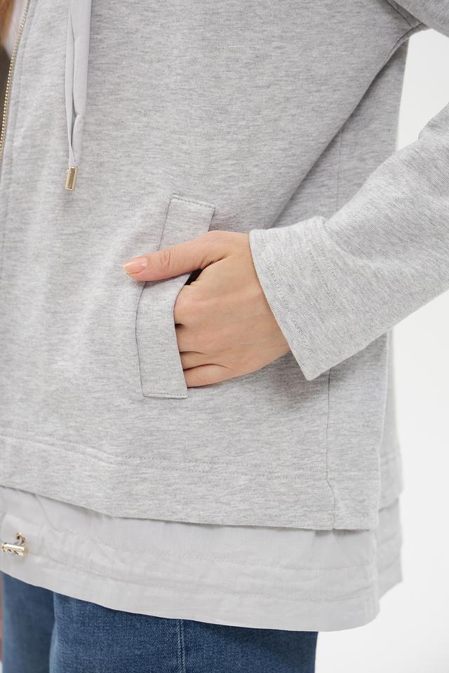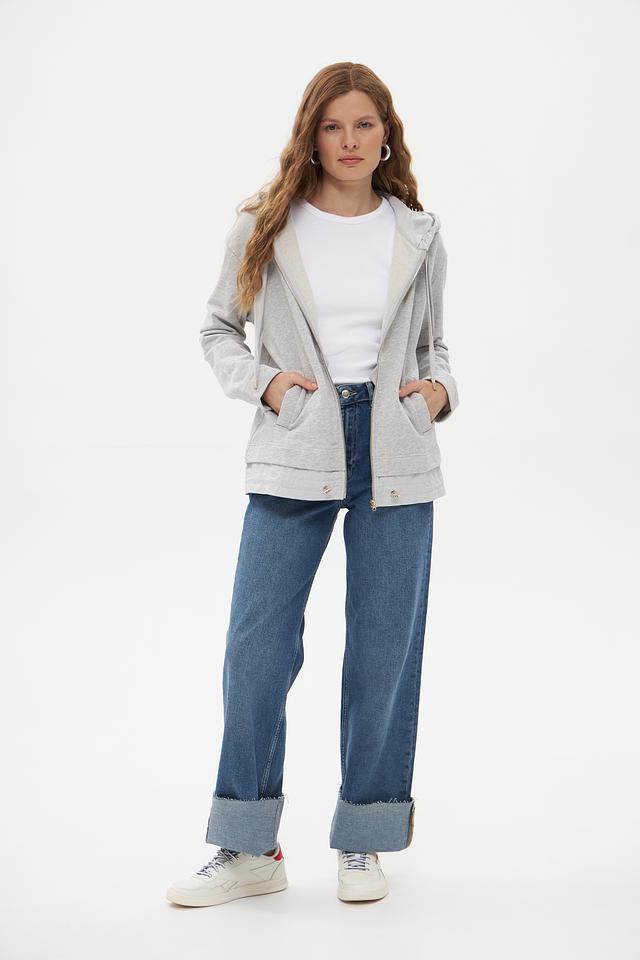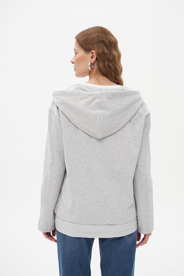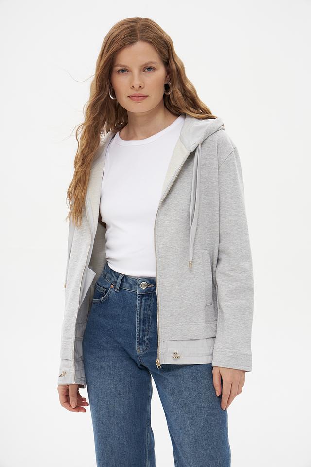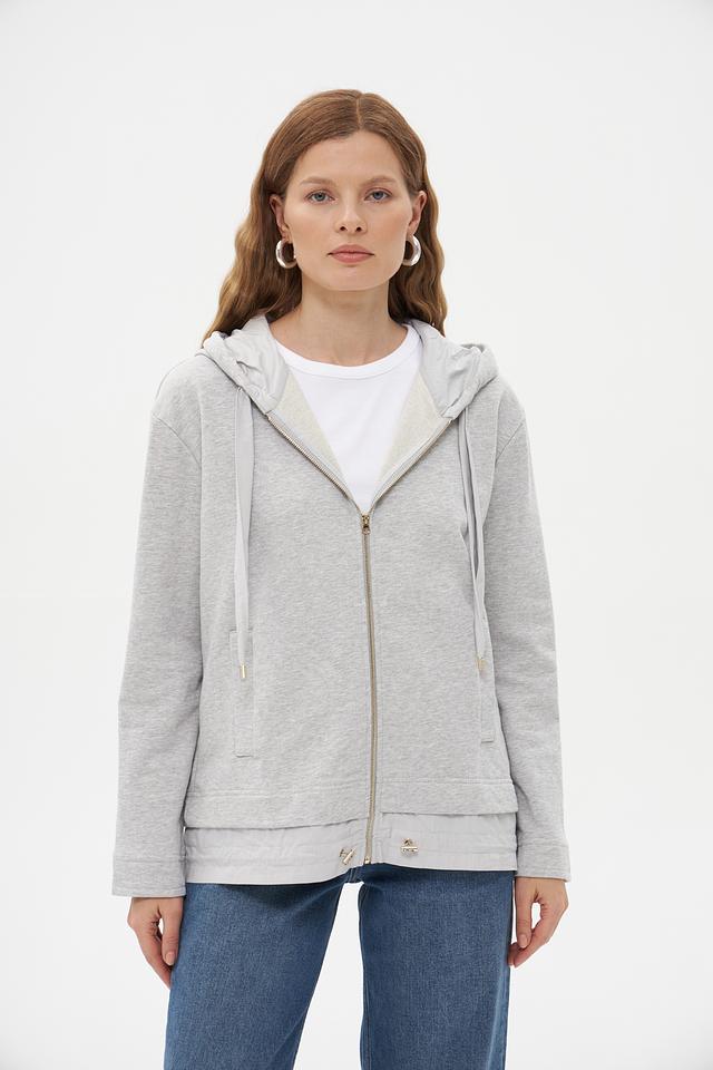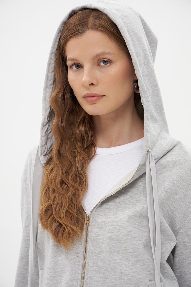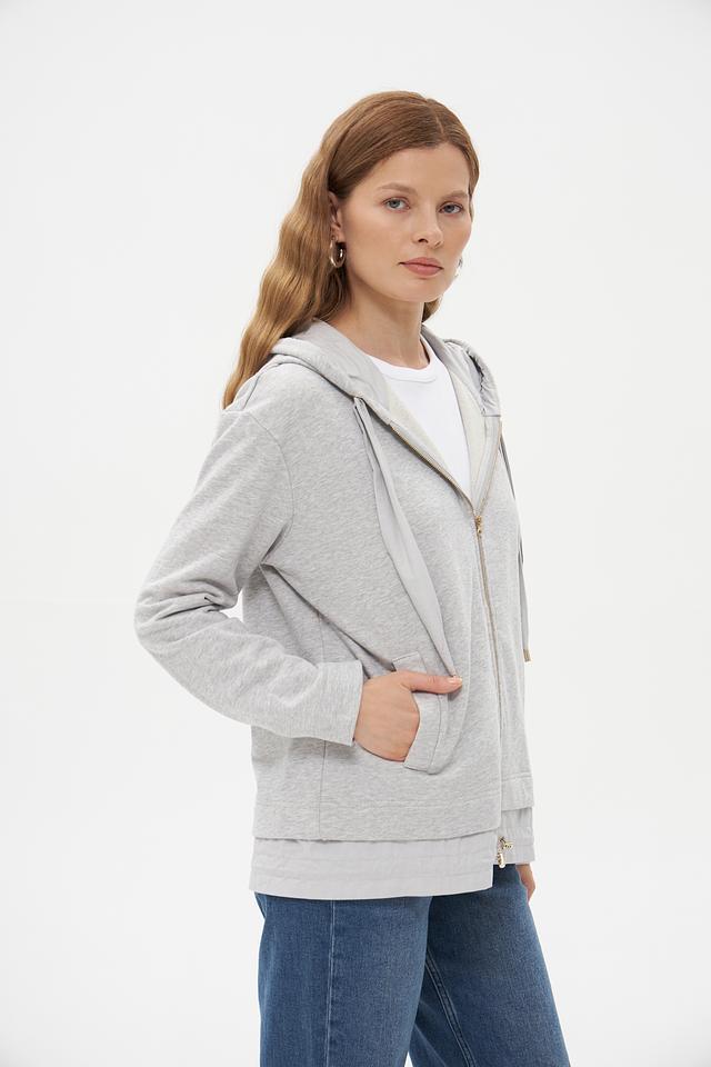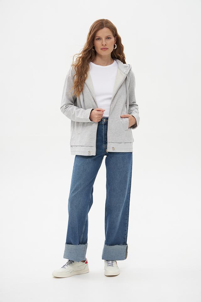 Модель имеет серый цвет и оснащена удобной молнией, позволяющей регулировать температуру и создавать разные образы. Капюшон добавляет практичности и защищает от ветра.