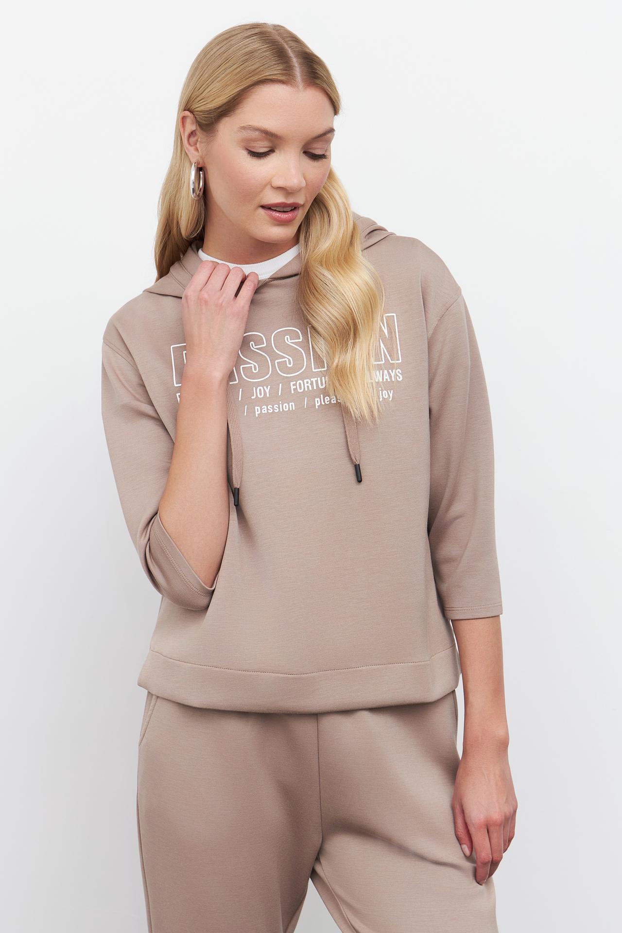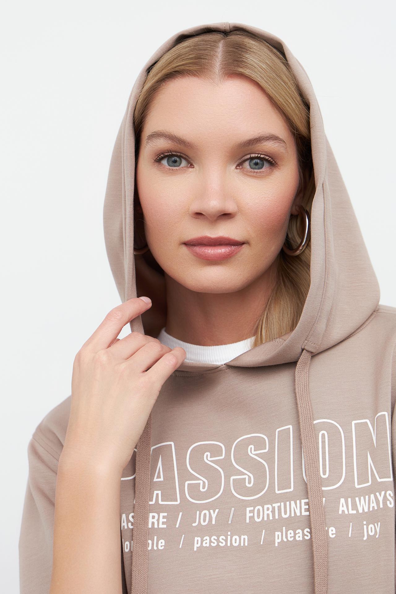 Женский пуловер Pezzo – это идеальное решение для повседневного гардероба, сочетающее комфорт и современный дизайн. Модель выполнена в универсальном бежевом цвете и украшена стильным текстовым принтом "PASSION" на груди, придающим изделию динамичный акцент. Высококачественный состав из 51% модала, 44% полиэстера и 5% эластана обеспечивает приятные тактильные ощущения и отличную посадку.