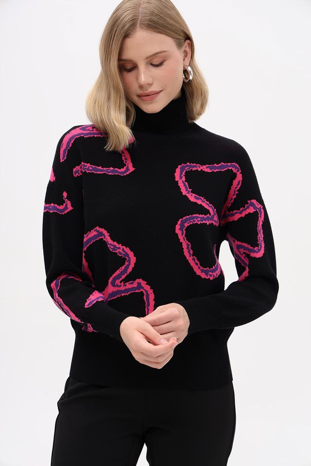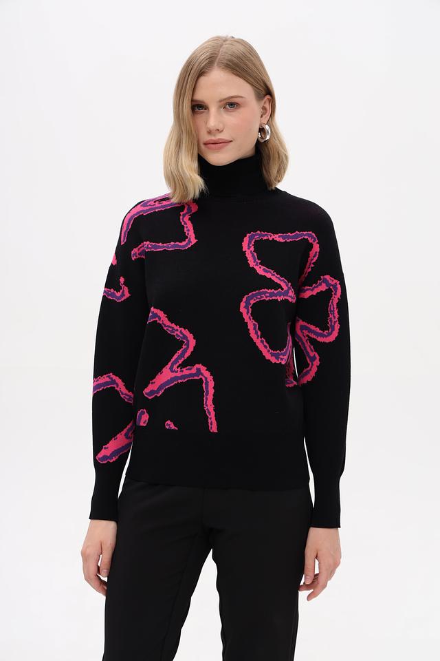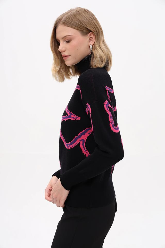 Чёрный пуловер Pezzo с оригинальным розовым абстрактным рисунком. Изготовлен из мягкой вискозы с добавлением полиэстера для комфорта и износостойкости. Высокий воротник и приталенный силуэт. Состав: вискоза 72%, полиэстер 28%