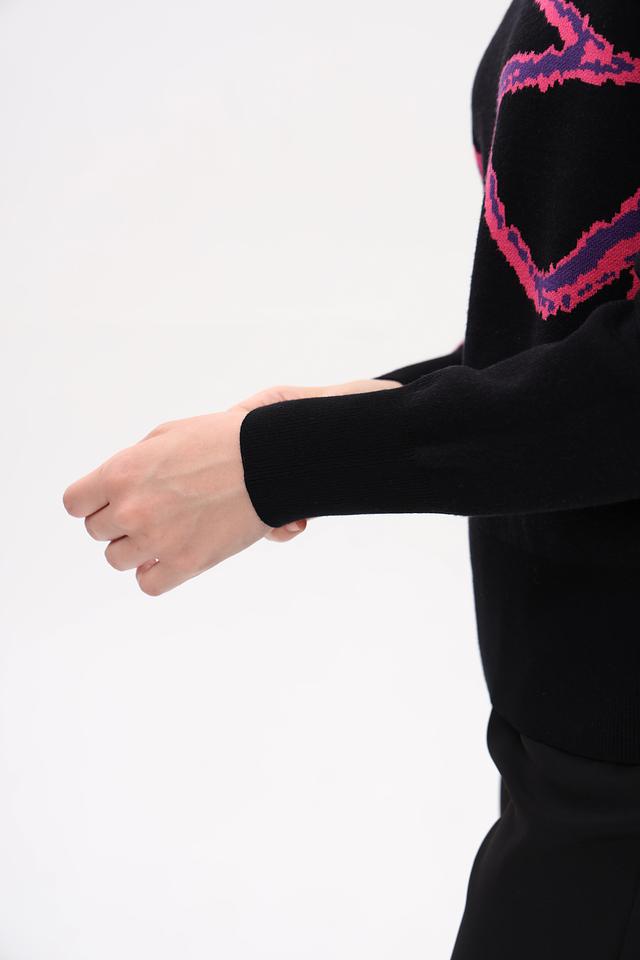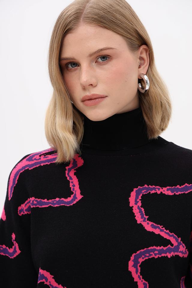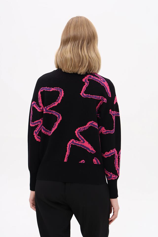 Пуловер имеет высокий воротник, который визуально вытягивает шею и придает образу элегантность. Дизайн дополнен ярким абстрактным рисунком розового цвета, который делает этот пуловер по-настоящему уникальным и стильным. Приталенный силуэт подчеркивает достоинства фигуры.