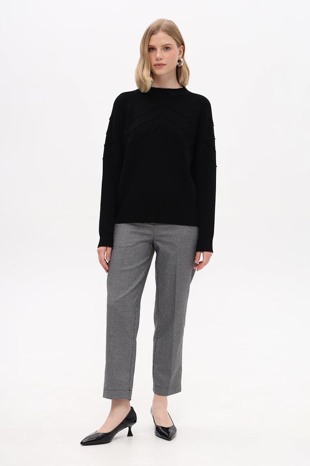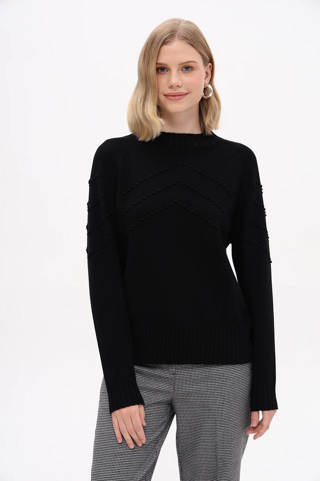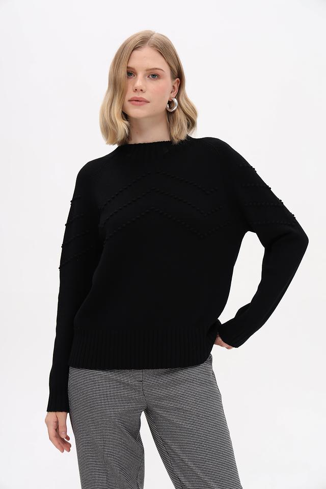 Модель имеет прямой крой, длинные рукава и круглый вырез горловины. Передняя часть пуловера украшена рельефной текстурой в виде небольших бусин, что придает изделию особый шарм и изысканность.