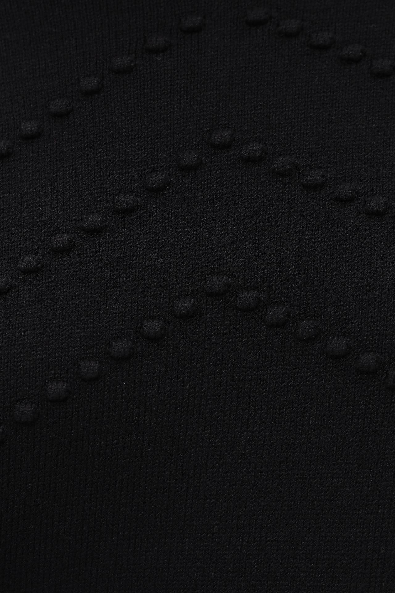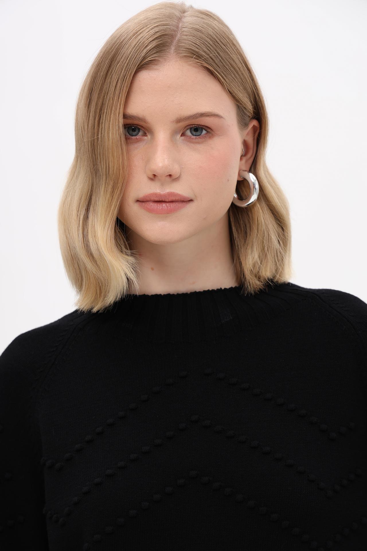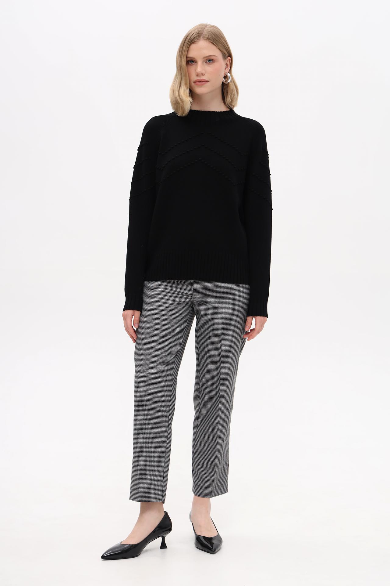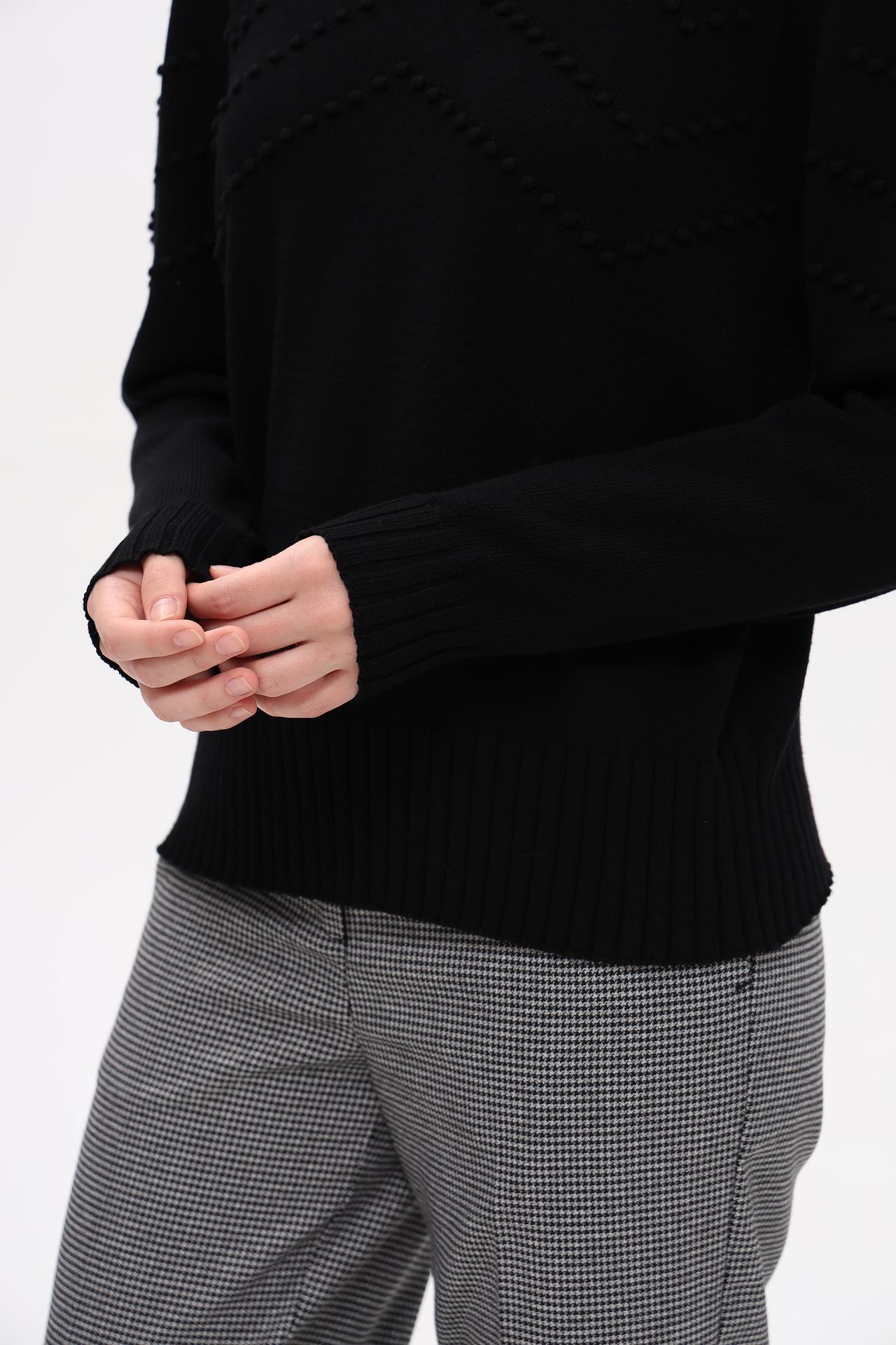 Лаконичный дизайн пуловера дополнен эффектным геометрическим узором на груди и рукавах, выполненным в технике мелких выпуклых элементов. Этот акцент придает изделию особую изысканность и делает его заметным в любом гардеробе. Круглый вырез горловины и длинные рукава создают классический силуэт, подходящий для различных случаев.