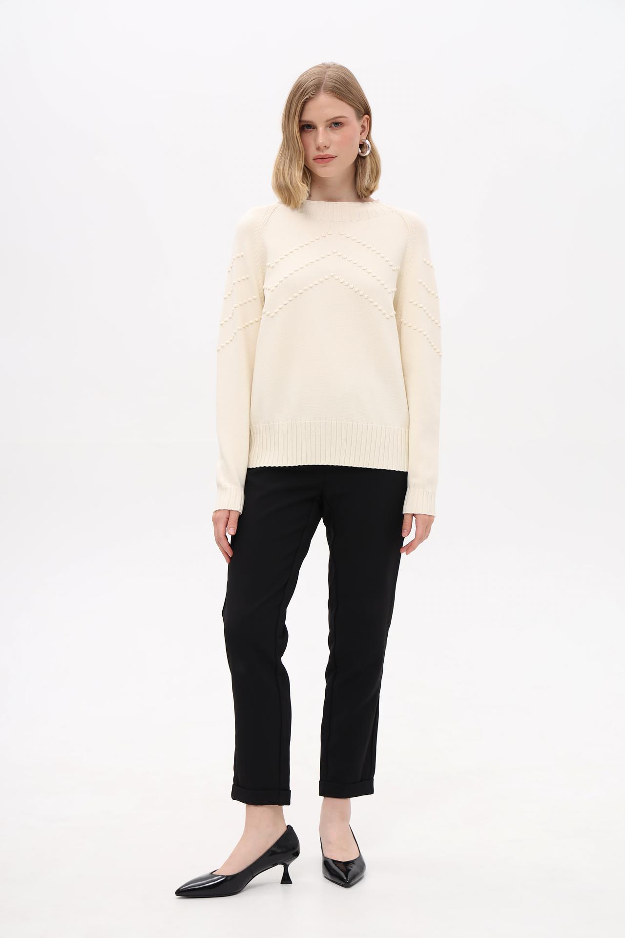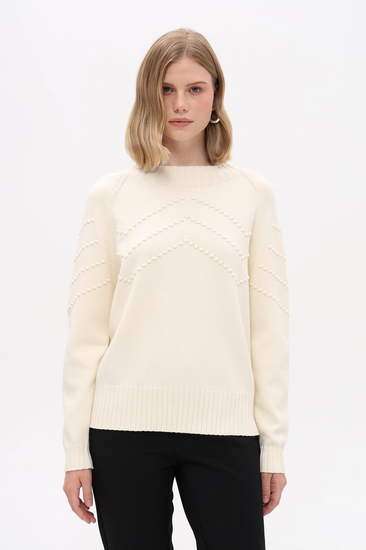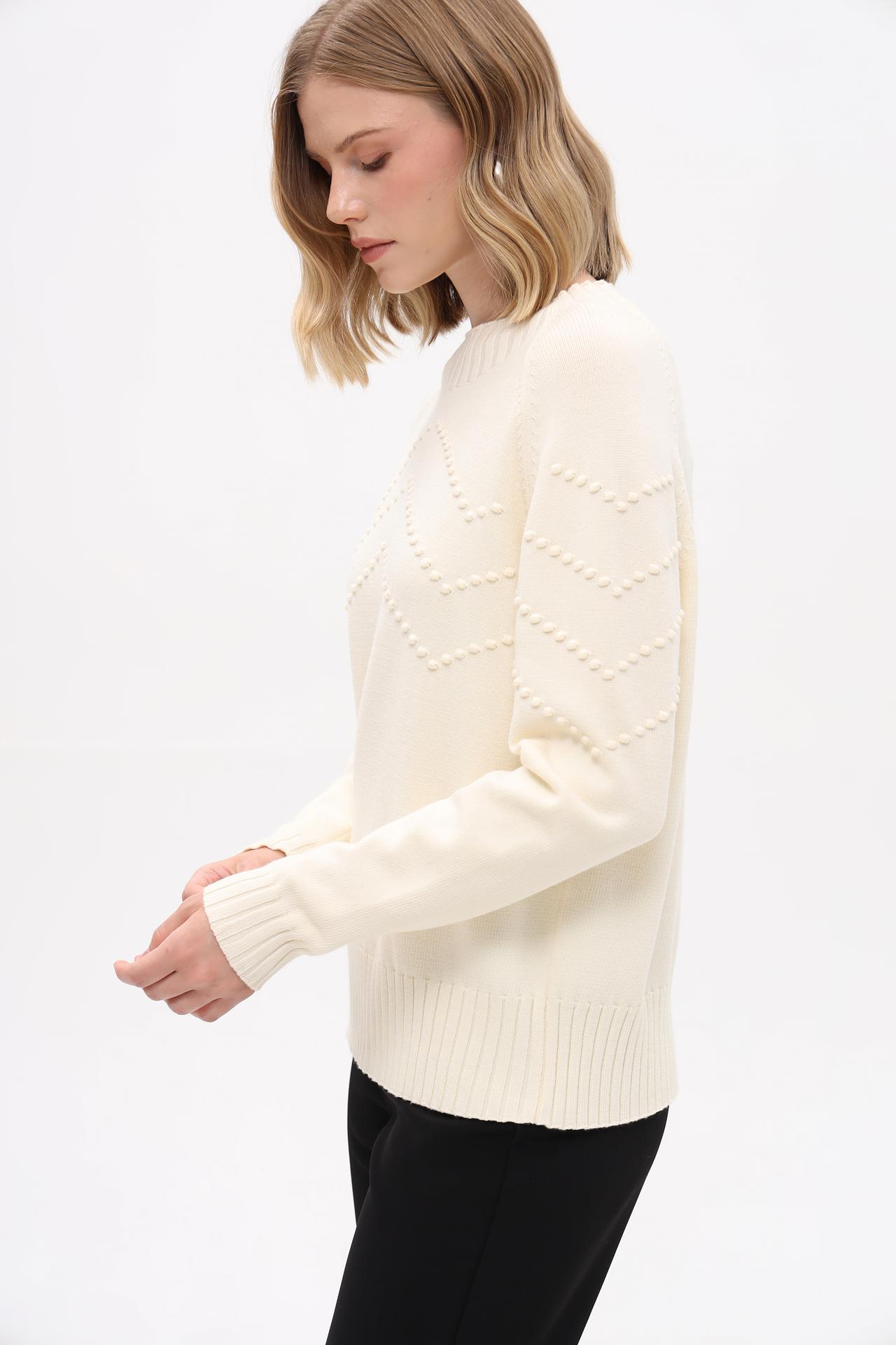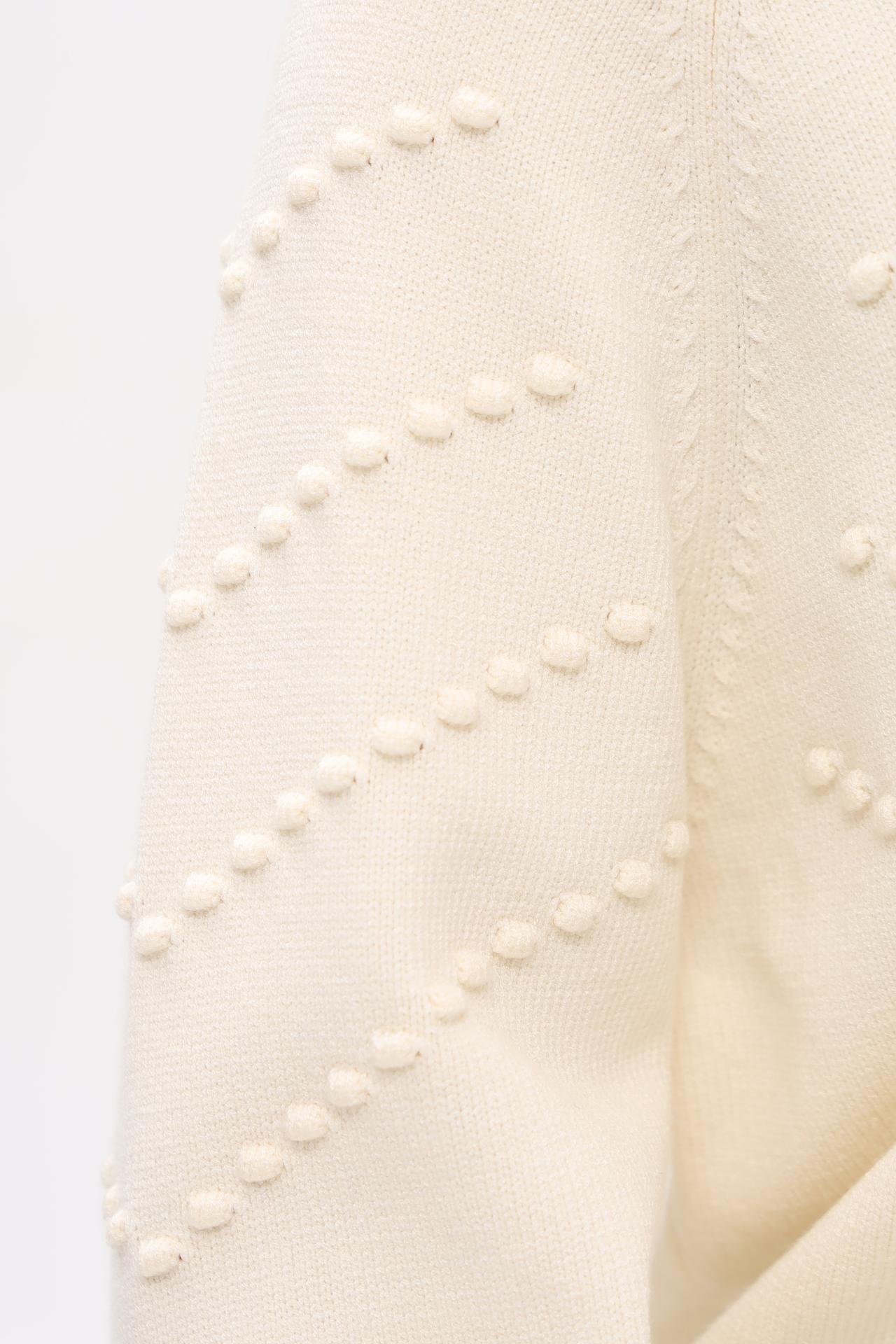 - Изысканный дизайн: Бежевый пуловер выделяется уникальным фактурным узором из объемных точек, расположенных шевронами на груди и горизонтальными линиями на рукавах, придавая образу особую изюминку.