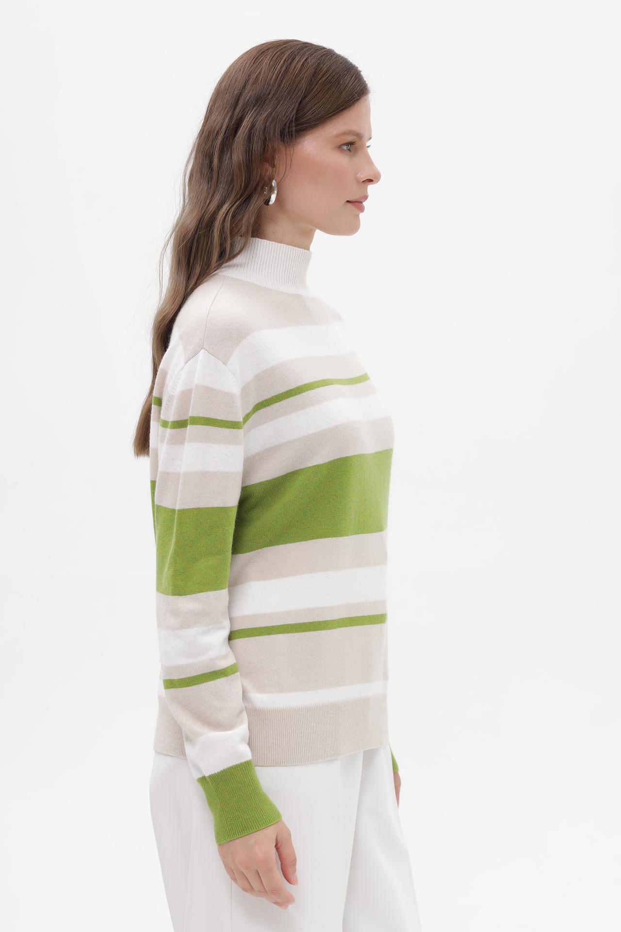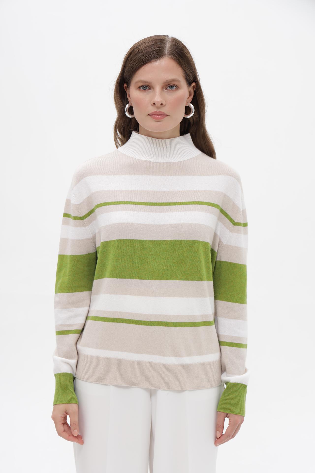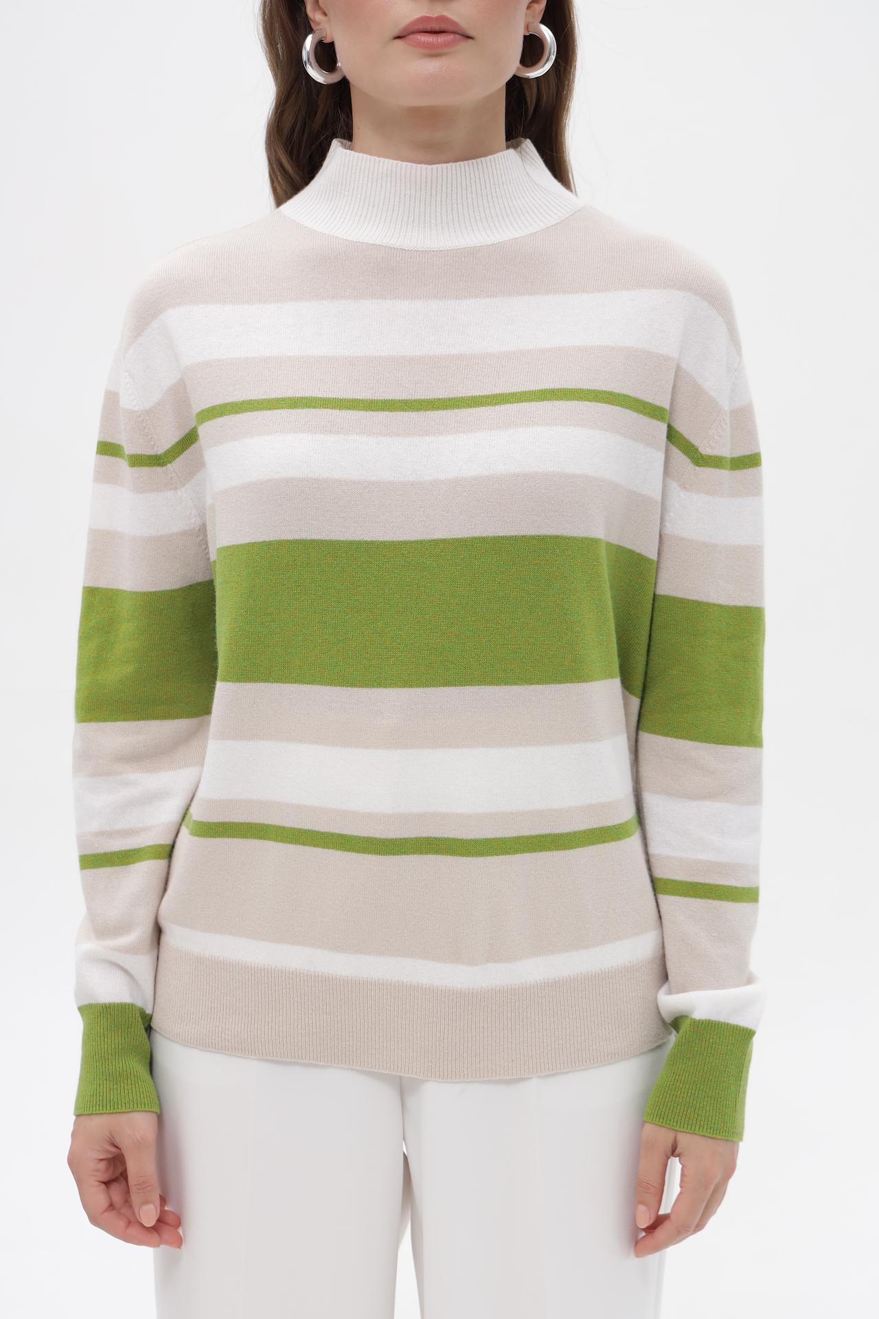 Стильный пуловер от Pezzo с воротником-гольф – идеальный выбор для создания элегантных образов. Оригинальный дизайн в полоску, выполненный в классических бежевых, белых и ярких зеленых тонах, добавит изюминку в ваш гардероб. Модель с длинным рукавом и комфортным воротом станет незаменимой вещью в межсезонье, обеспечивая тепло и уют.