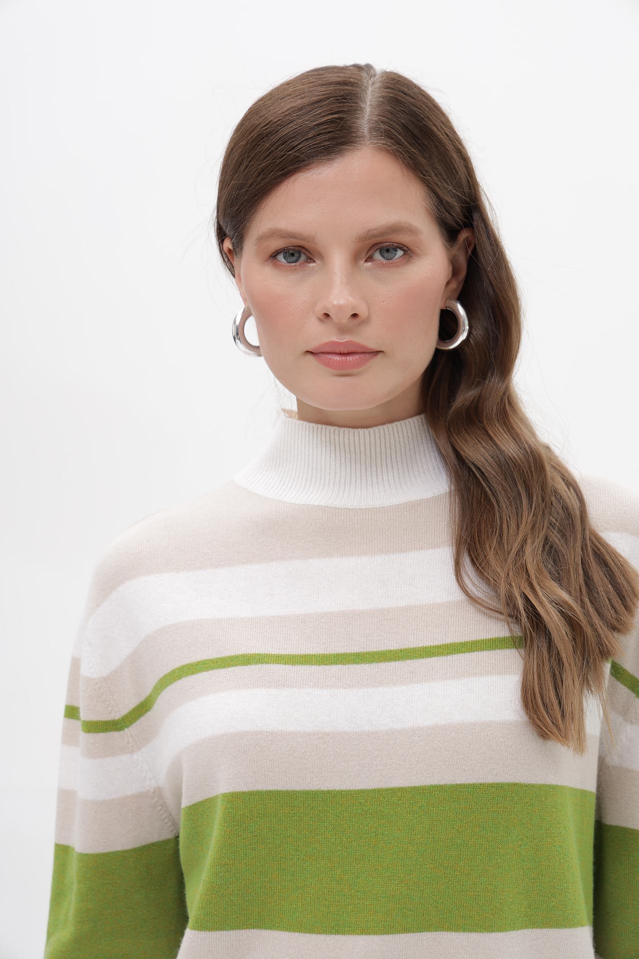 - Дизайн: Классический крой с высоким воротником и принтом в горизонтальную полоску делает эту модель универсальной. Пуловер легко впишется как в повседневный, так и в более изысканный наряд.