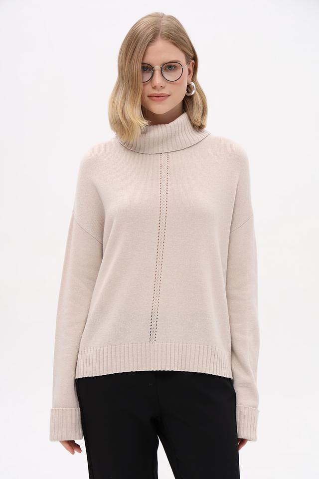 Пуловер имеет высокий ворот, который подчеркивает элегантность силуэта, и оригинальную текстурную вставку по центру переда. Свободный крой не сковывает движения, а длинные рукава делают его подходящим для повседневной носки.