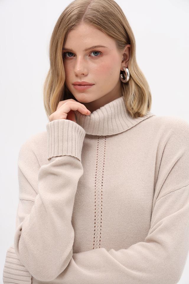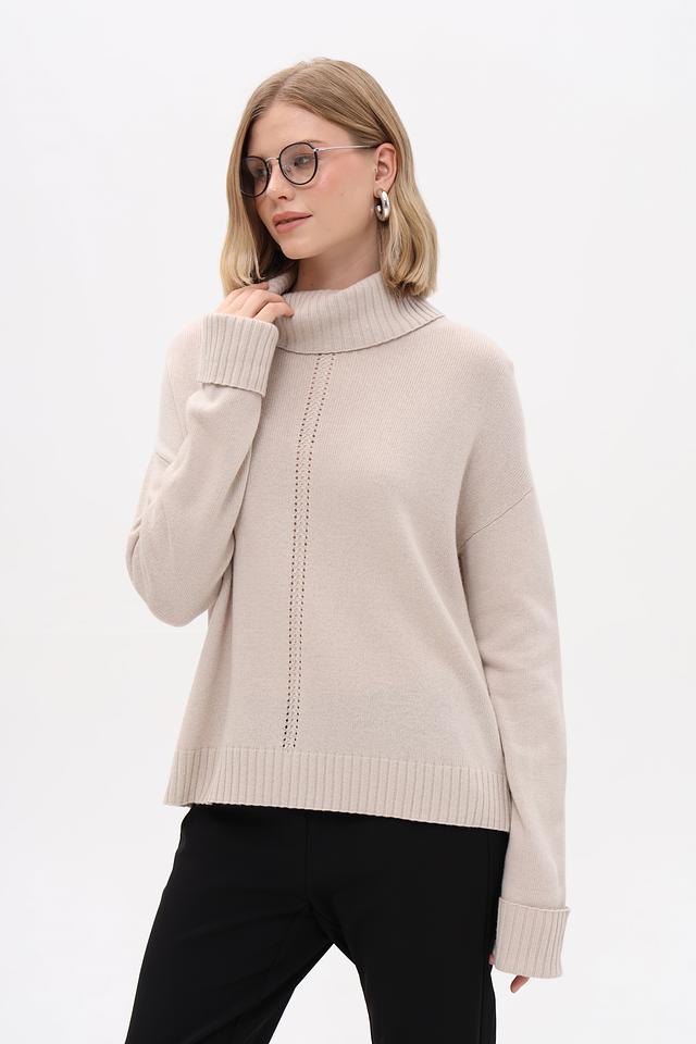 Бежевый пуловер от Pezzo с высоким воротом и текстурной вставкой. Изготовлен из мягкой смеси вискозы, нейлона, шерсти, хлопка и кашемира для комфорта и тепла. Состав: вискоза 33%, нейлон 23%, шерсть 20%, хлопок 20%, кашемир 4%