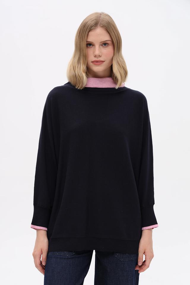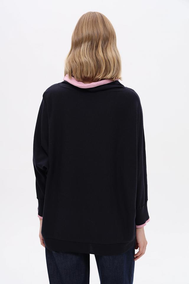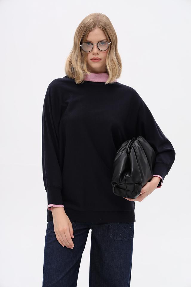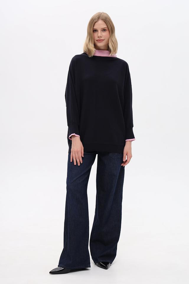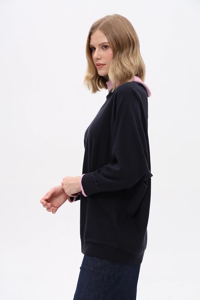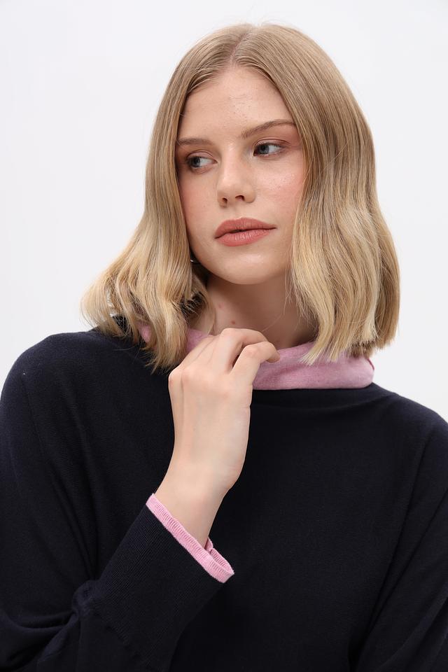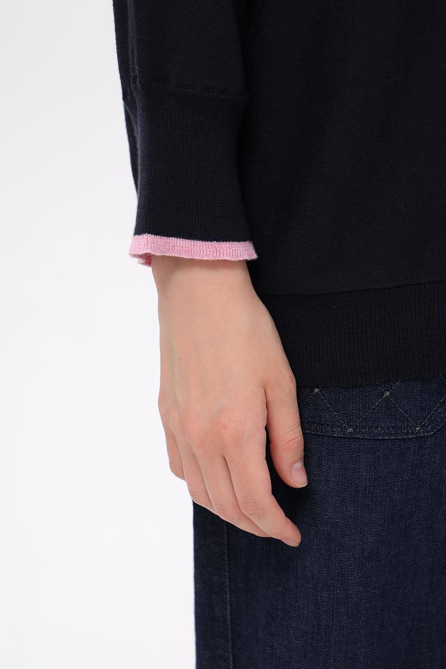 Тёмно-синий пуловер Pezzo свободного кроя с розовой отделкой на горловине и манжетах. Изготовлен из мягкого хлопка с добавлением шелка и кашемира для комфорта и изысканного внешнего вида. Состав: хлопок 85%, шелк 10%, кашемир 5%