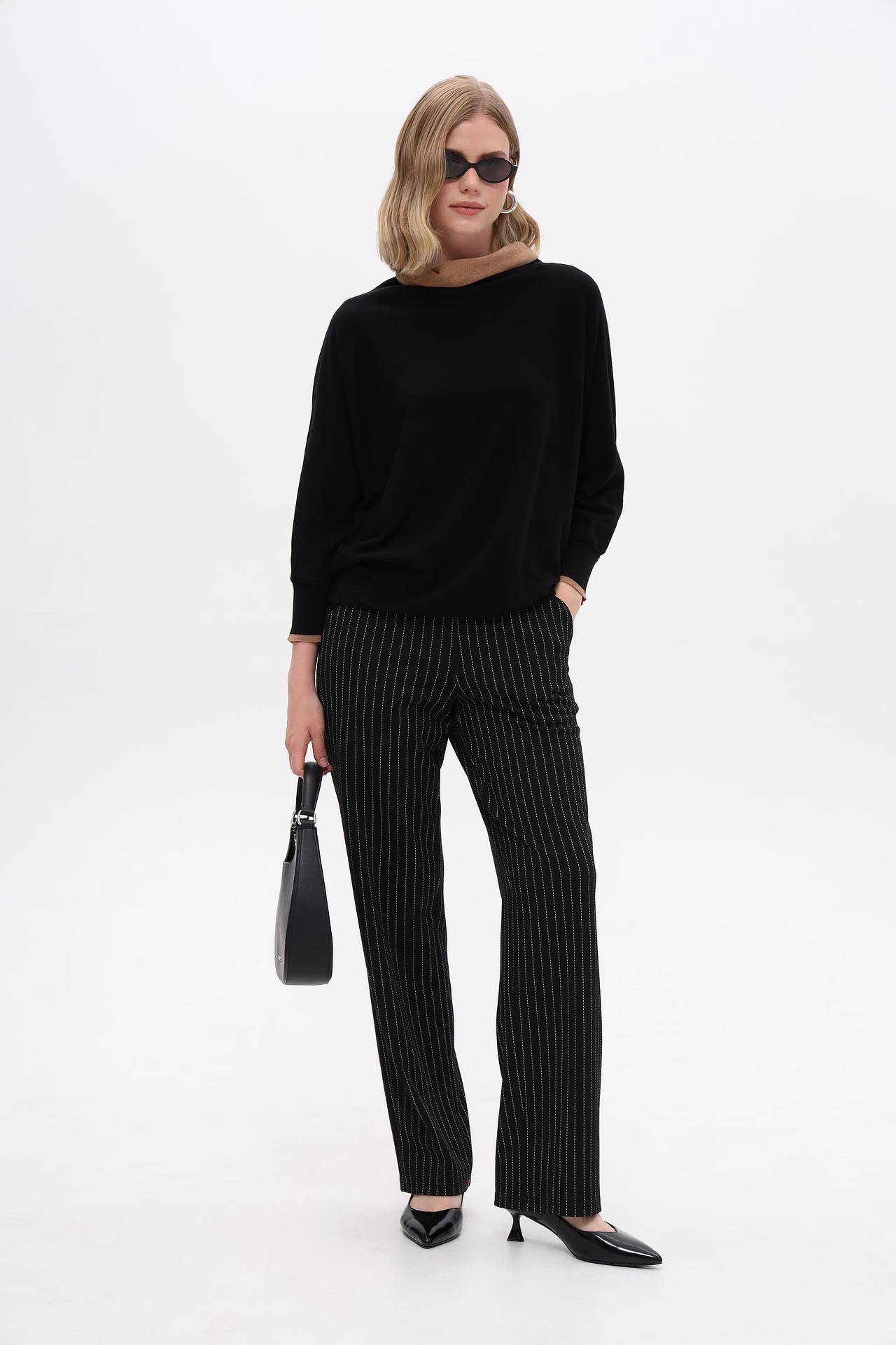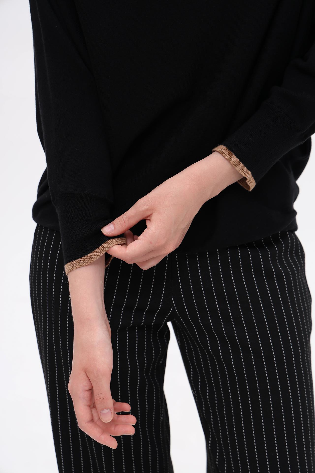 - Дизайн: Классический черный пуловер с расслабленным силуэтом и минималистичным дизайном. Акцентная отделка на воротнике и манжетах добавляет изысканности.