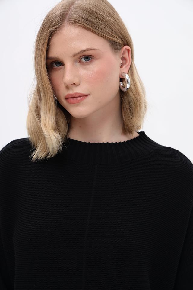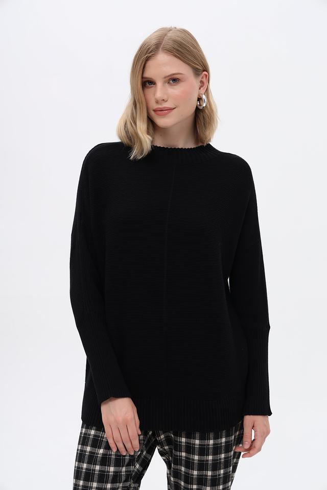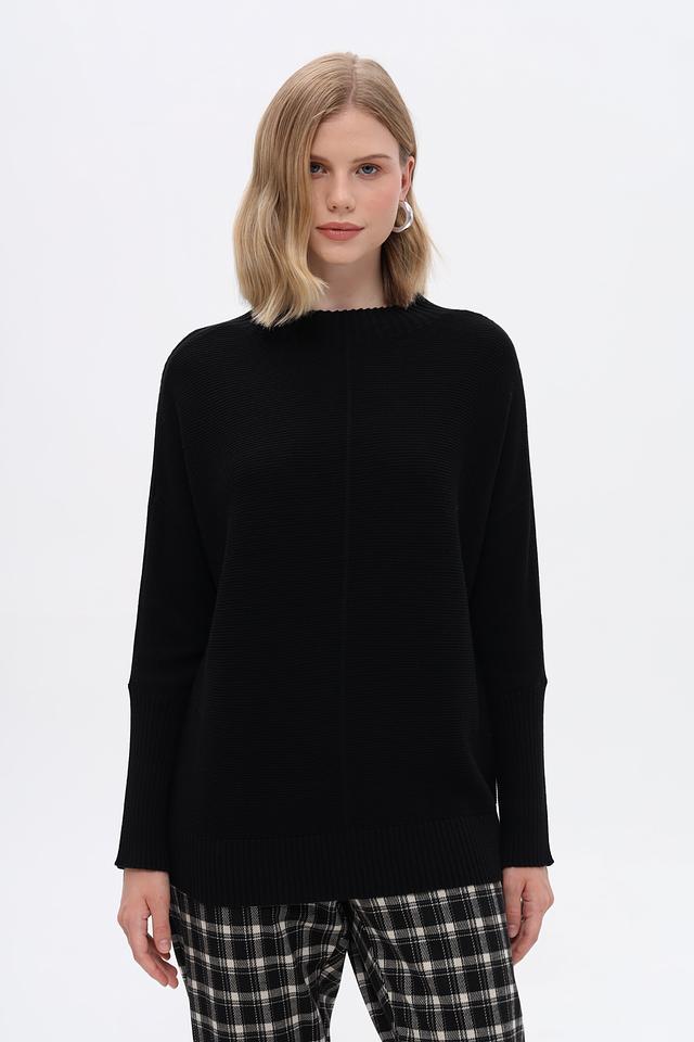 Пуловер имеет свободный крой, прямой силуэт и высокий воротник. Длинные рукава и эластичные манжеты обеспечивают комфортную посадку. Текстура вязания придает изделию объём и фактурность.