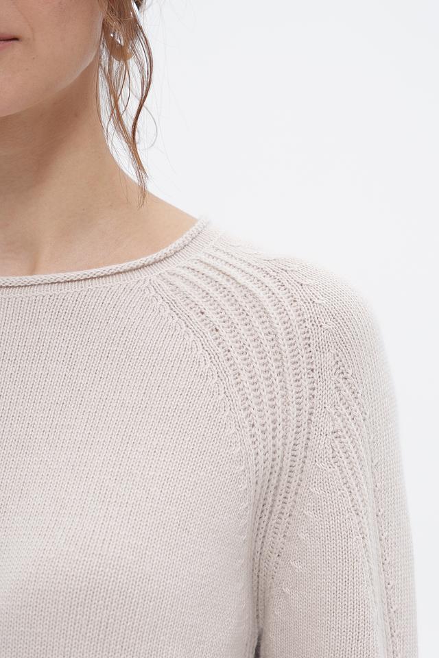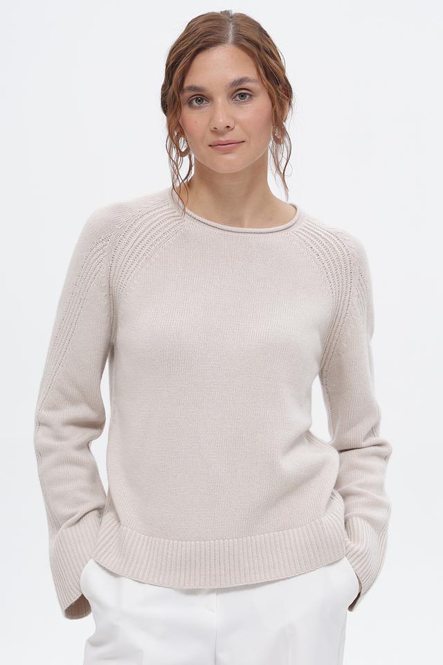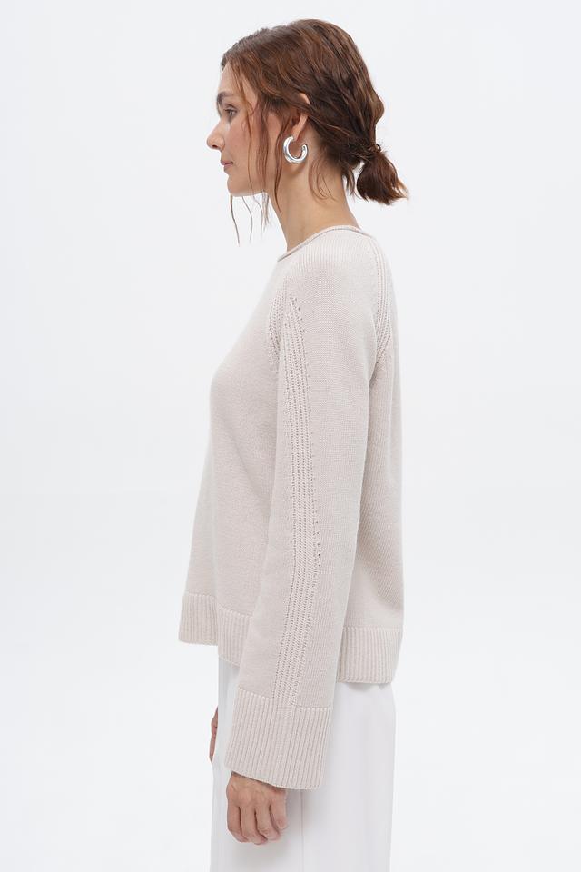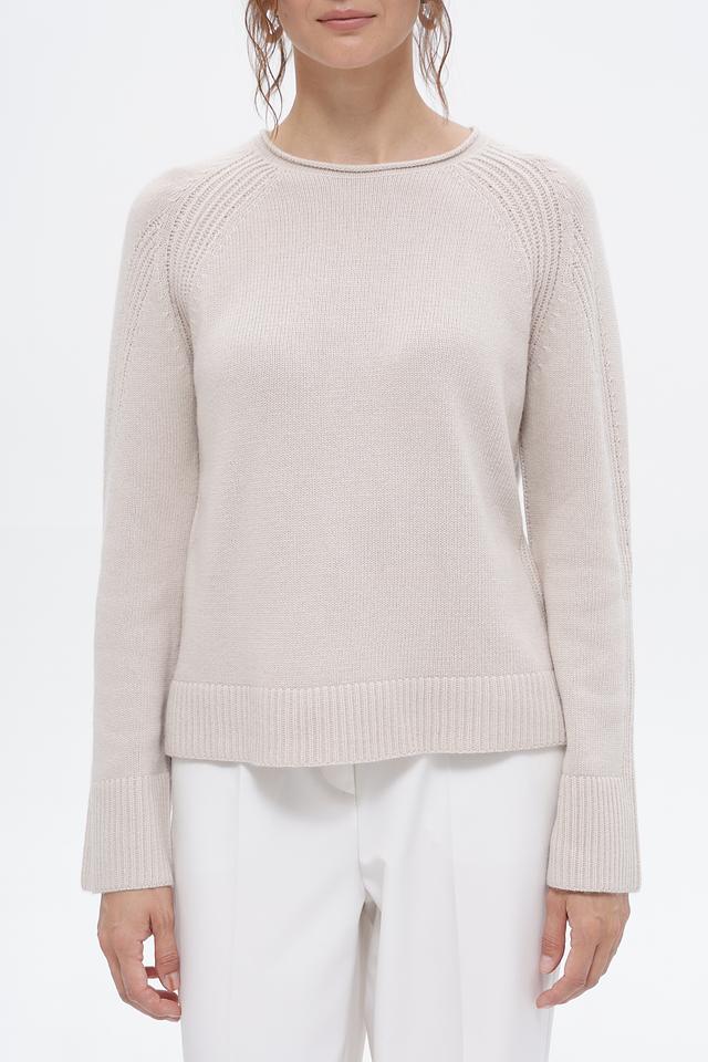 Модель имеет классический крой с круглым вырезом горловины и длинными рукавами. Особое внимание привлекает текстура вязки – лицевая в основной части и ажурная на плечах и рукавах, что придает изделию изысканность.