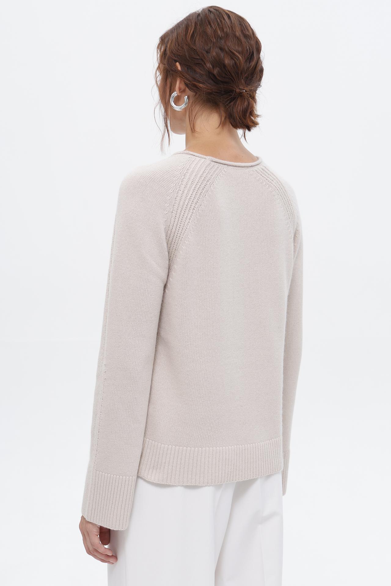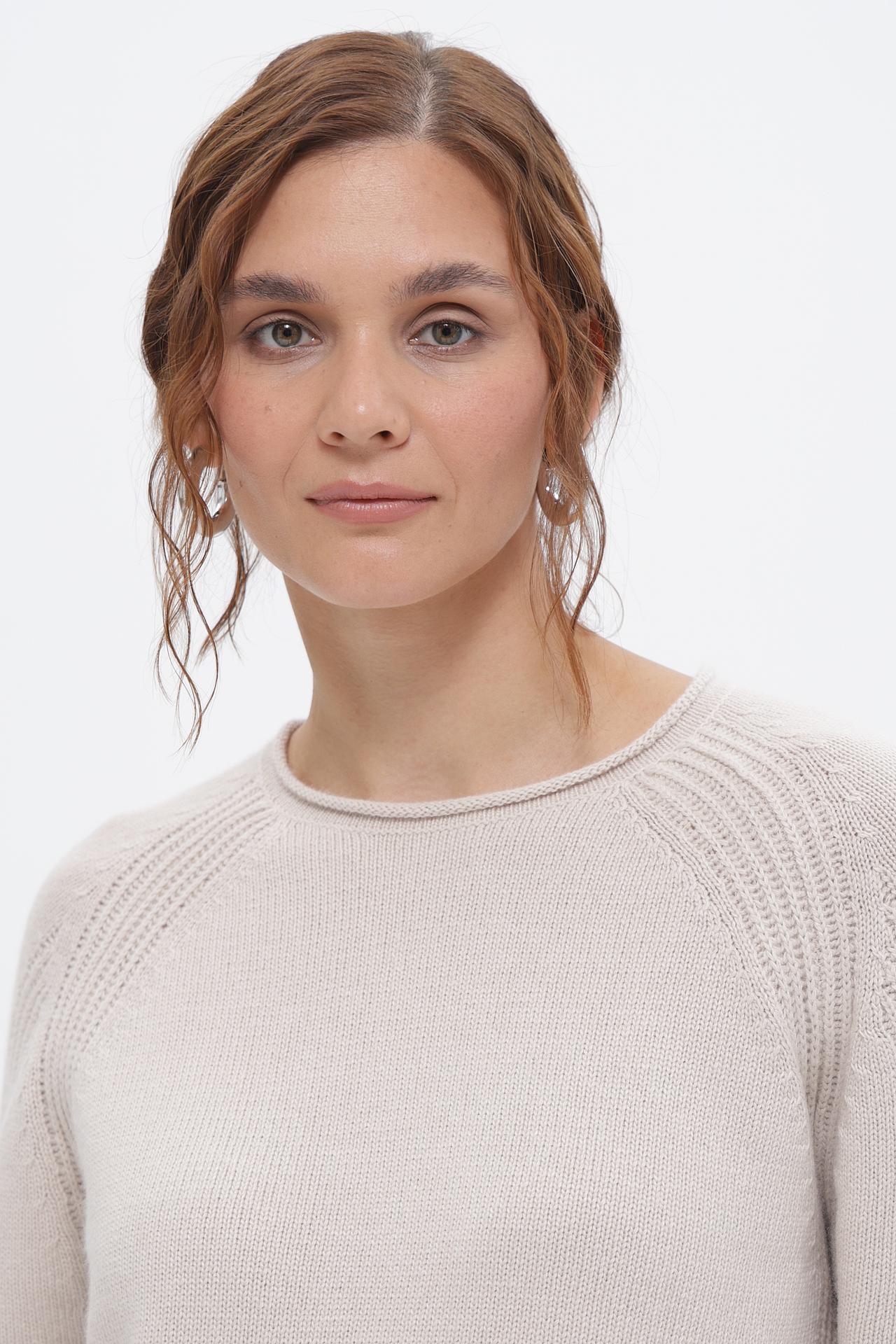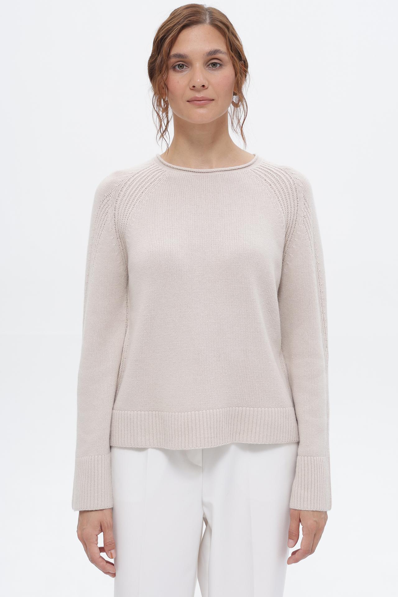 - Дизайн: Классический круглый вырез и рукав реглан создают утонченный силуэт. Декоративная вязка на плечах добавляет изысканности.
