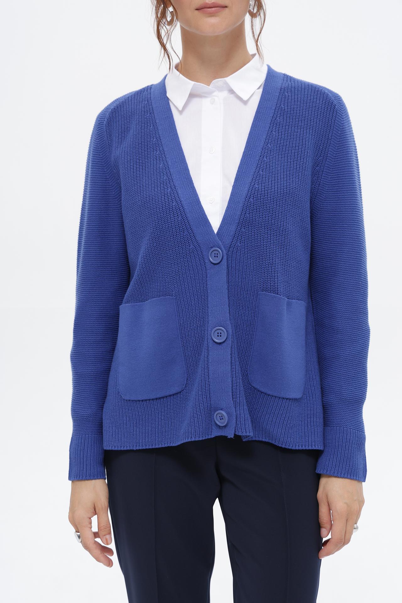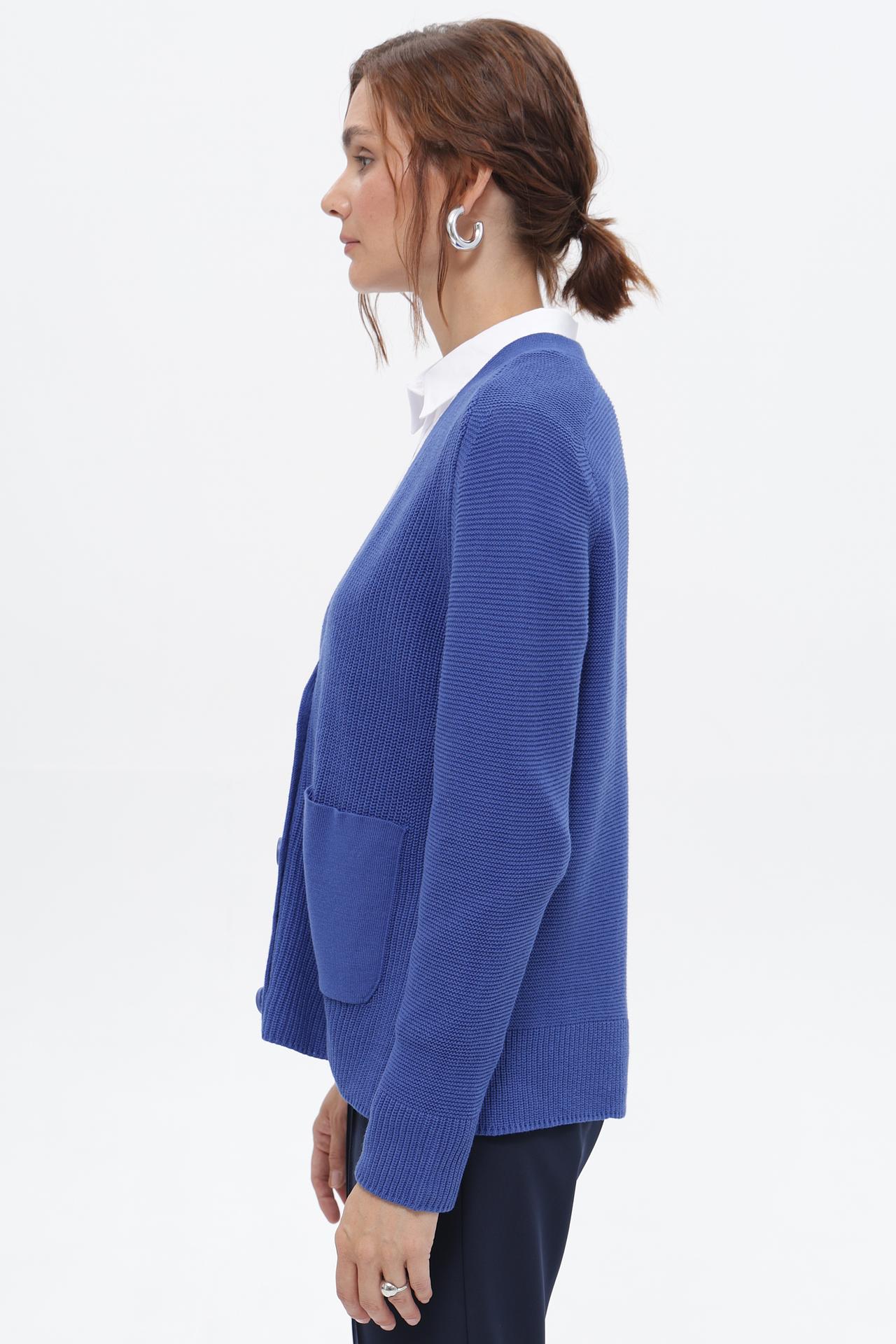 Жакет выполнен из приятной на ощупь смесовой ткани, состоящей из 60% хлопка и 40% акрила. Такое сочетание обеспечивает комфорт, воздухопроницаемость и долговечность изделия. Модель с V-образным вырезом и застежкой на пуговицы прекрасно садится по фигуре.