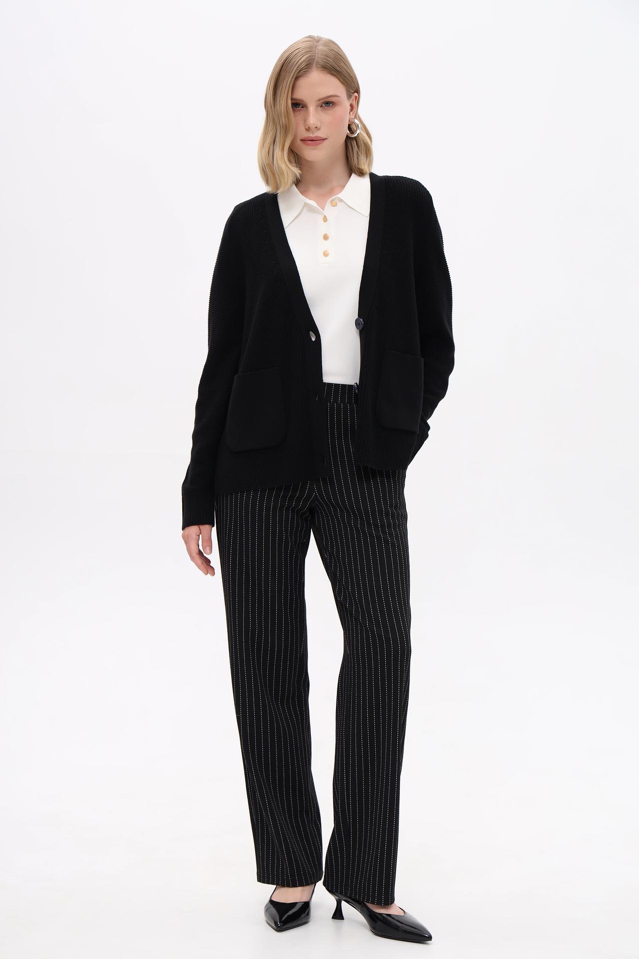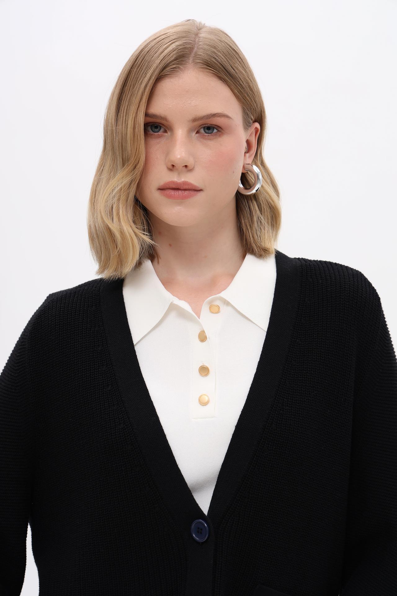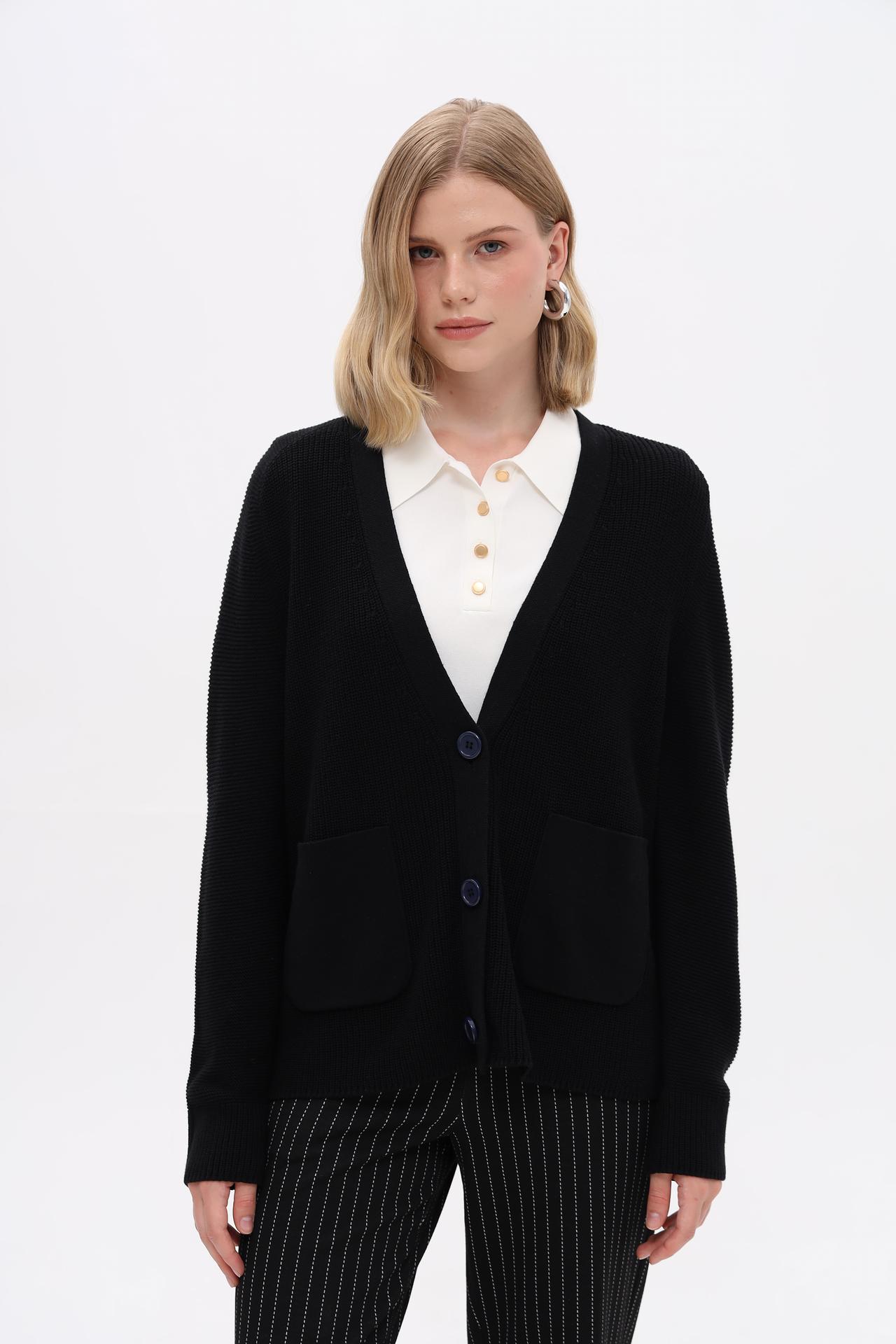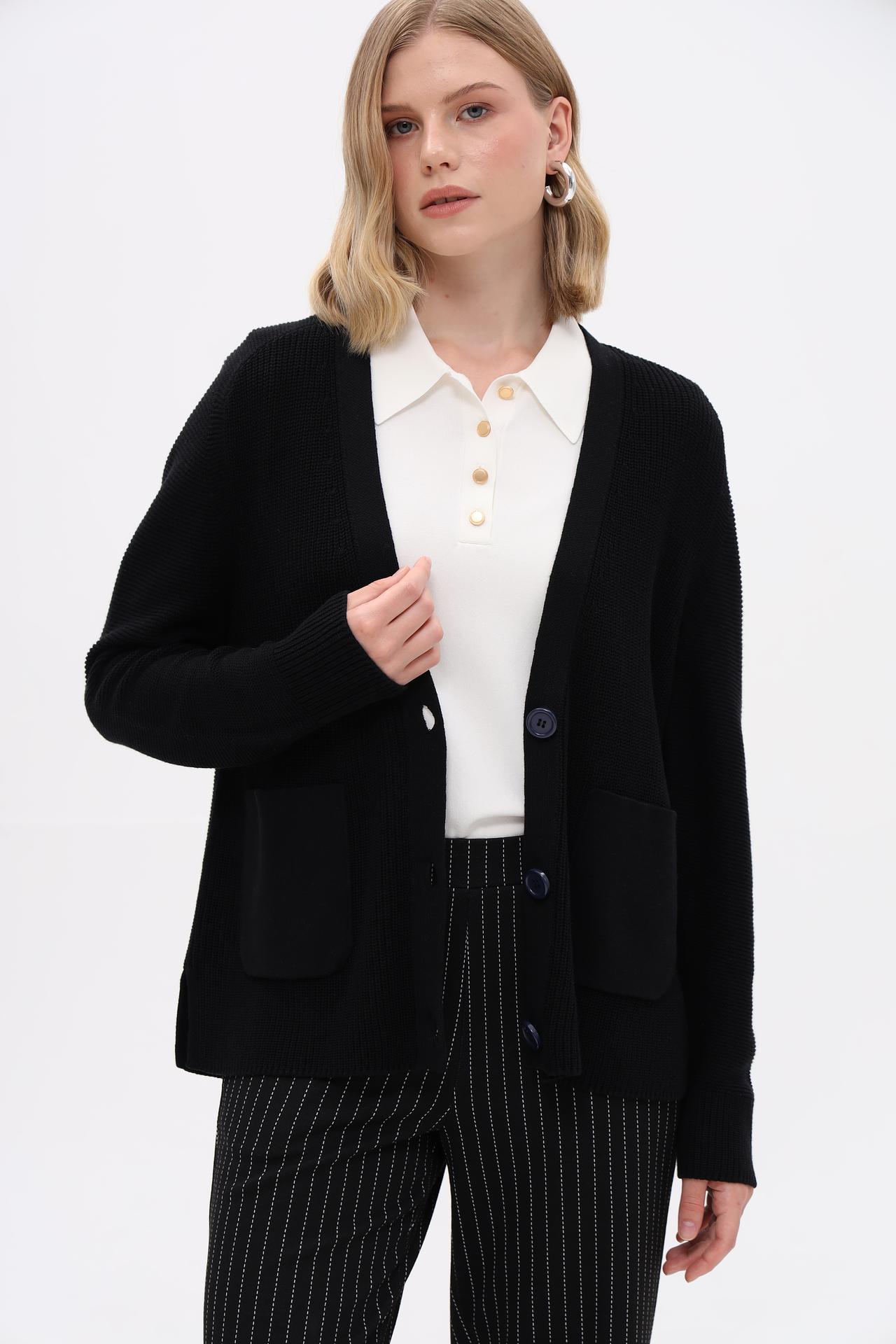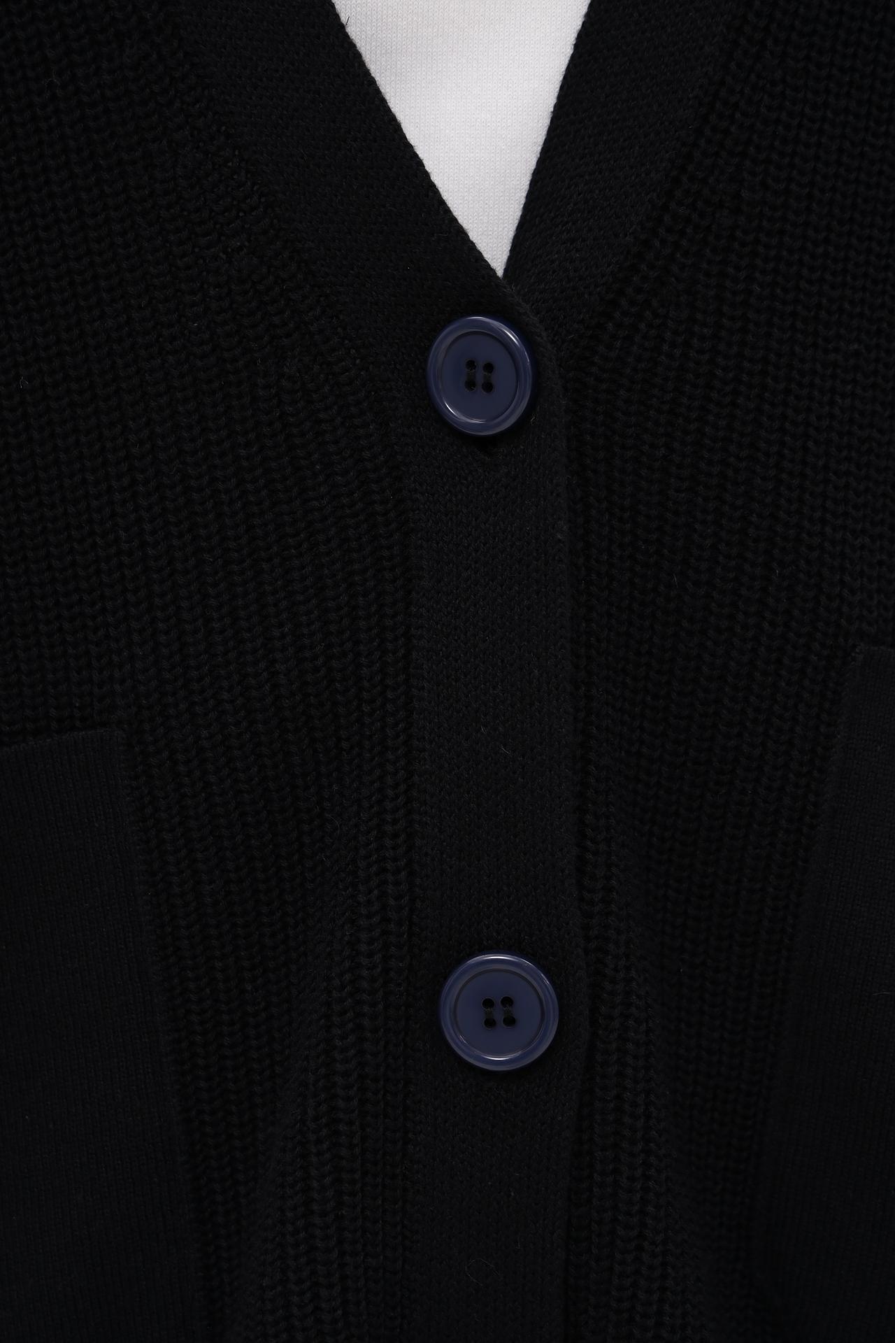 - Стильная деталь: Темно-синие пуговицы контрастируют с черным цветом жакета, добавляя изделию элегантности и оригинальности. Этот акцент подчеркивает внимание бренда к деталям.