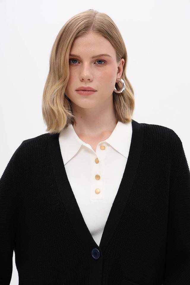 Кардиган имеет V-образный вырез, который визуально удлиняет шею и делает силуэт более изящным. Застёжка на пуговицах позволяет регулировать степень открытости и создавать различные образы. Накладные карманы добавляют функциональности и непринуждённости.