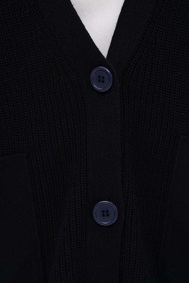 Чёрный кардиган Pezzo из мягкого трикотажа. Модель выполнена из хлопка с добавлением акрила, имеет V-образный вырез и застёжку на пуговицы. Состав: хлопок 60%, акрил 40%