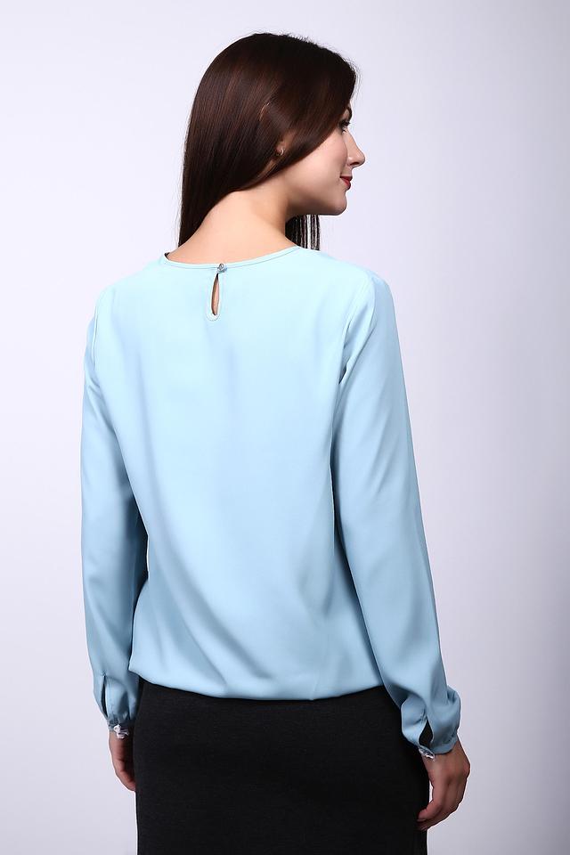 - Универсальность. Голубая блузка легко комбинируется с юбками и брюками различных фасонов, подходя как для строгого офисного образа, так и для элегантного повседневного наряда. Длинные рукава завершаются манжетами с легкой сборкой.