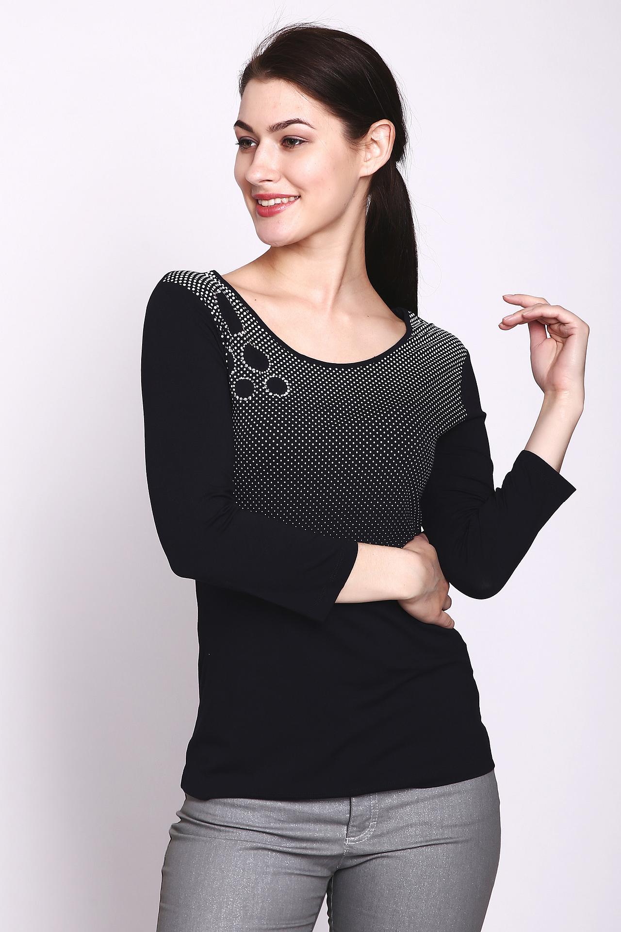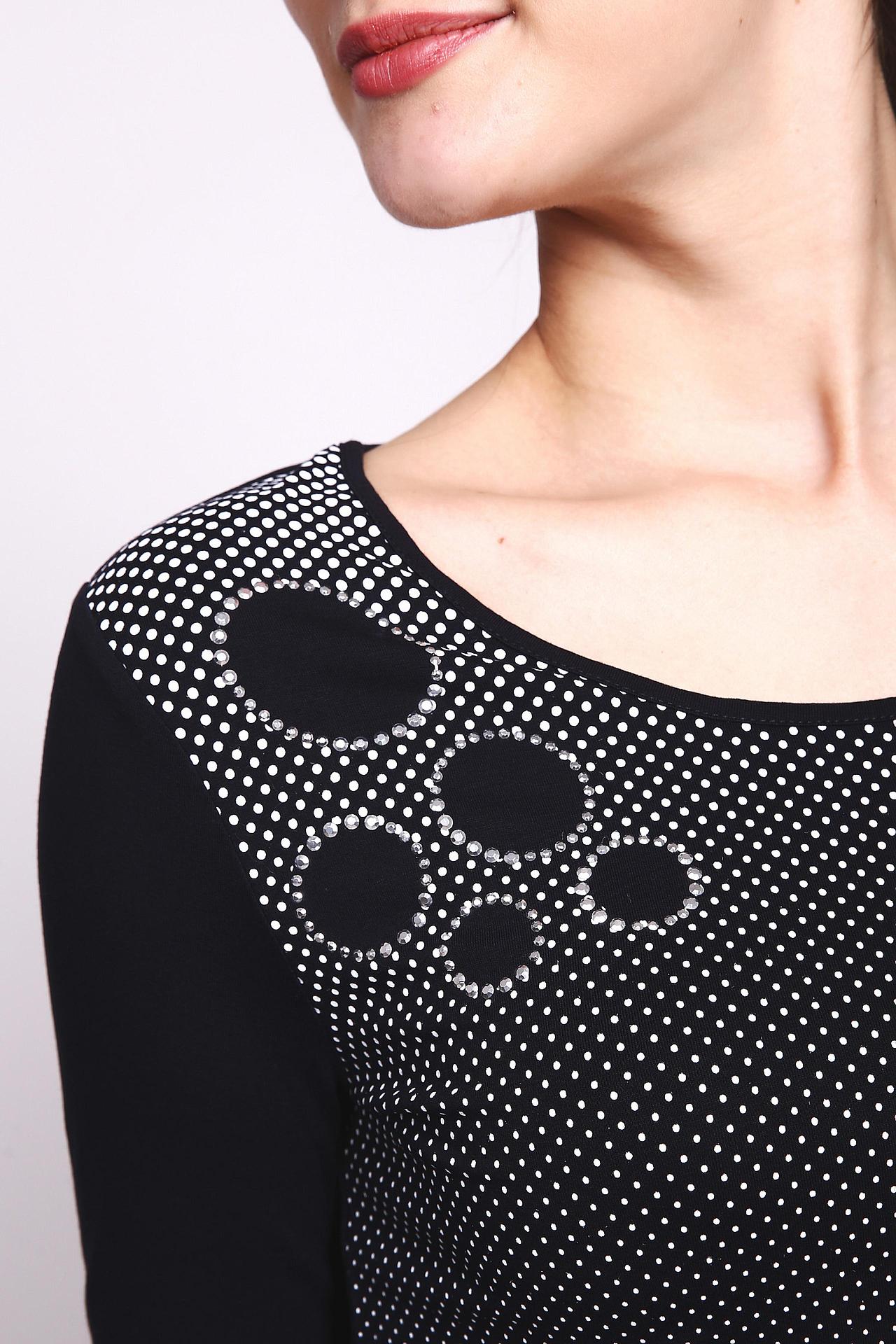 - Дизайн: Оригинальный принт в горошек с акцентом из декоративных кругов на плече делает блузу стильной и неповторимой.