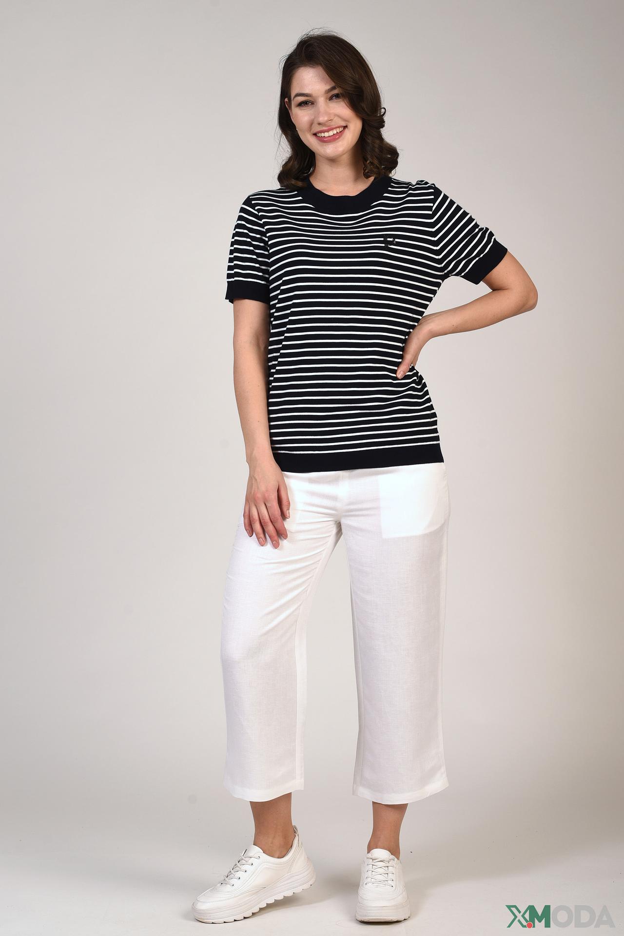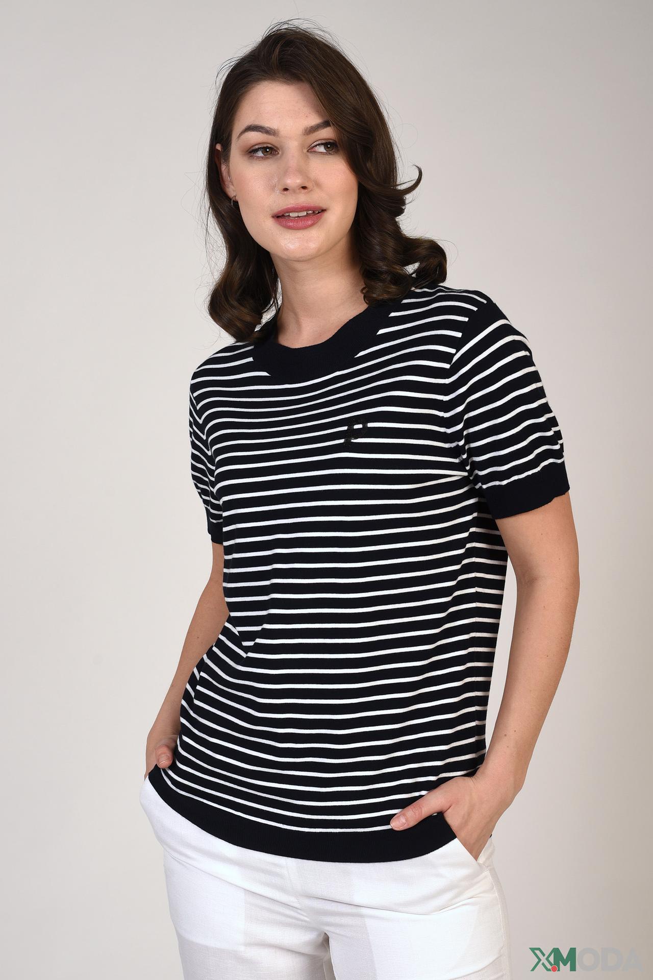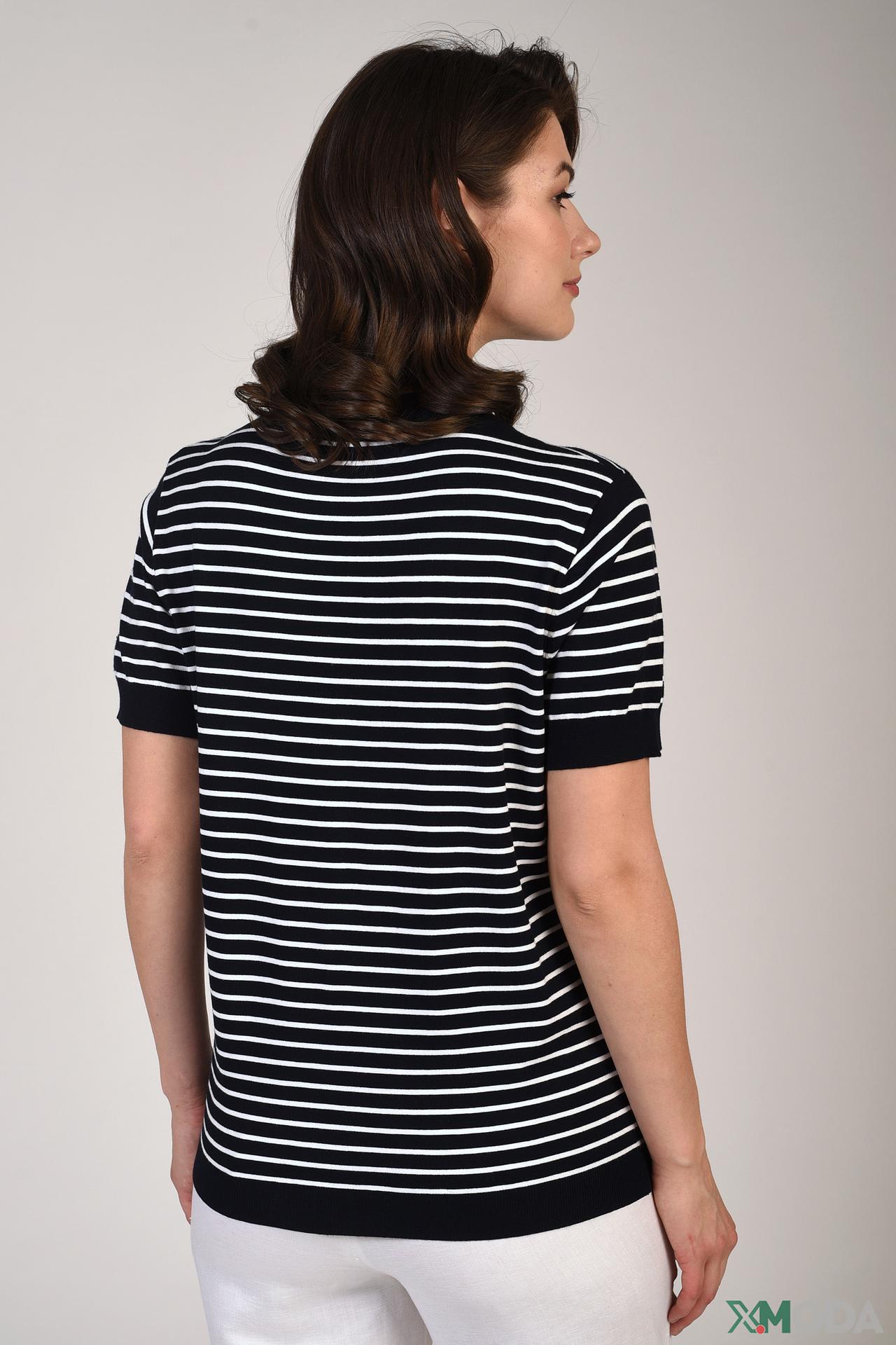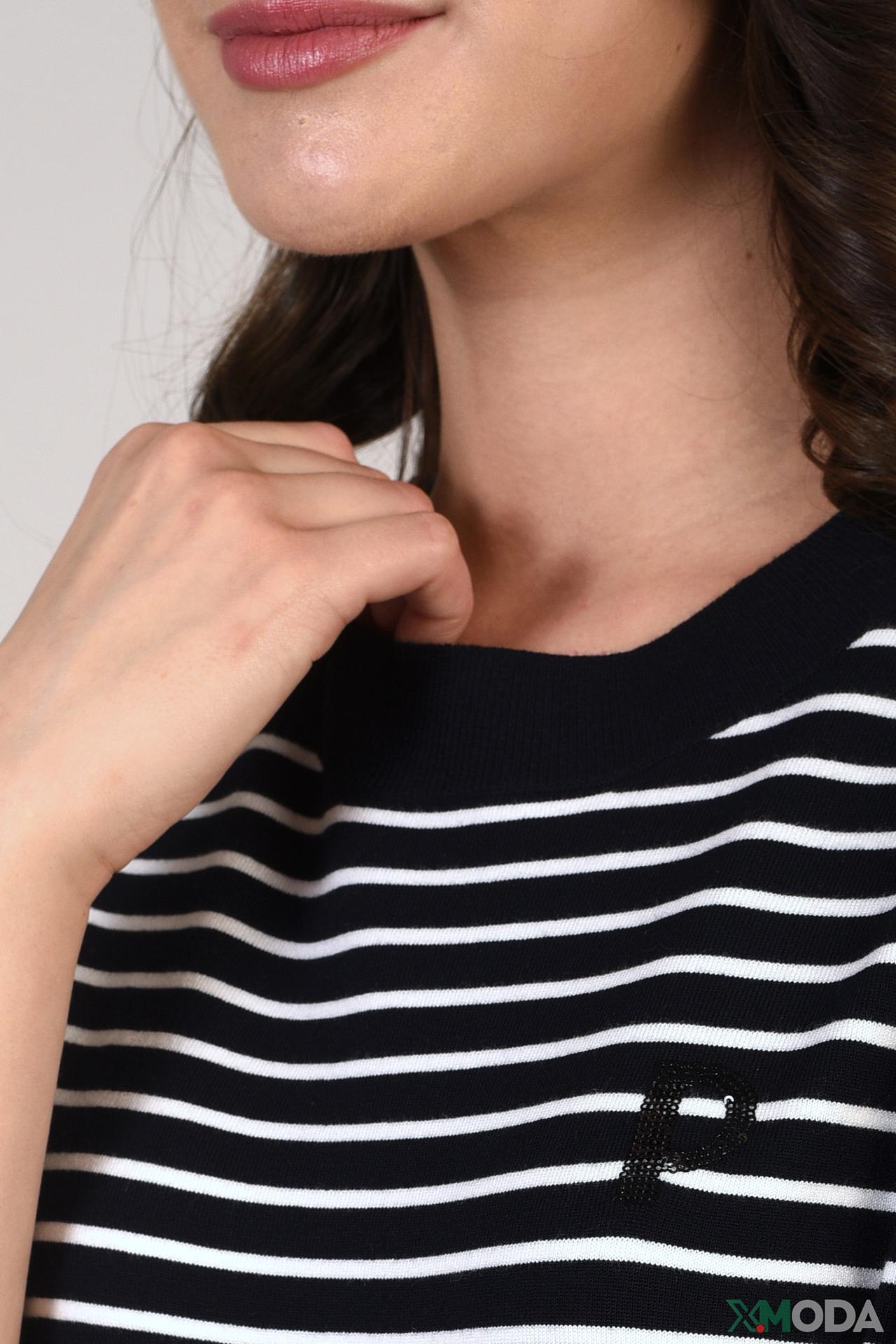 Стильный женский пуловер Pezzo в классическую черно-белую полоску. Модель с коротким рукавом и округлым вырезом горловины станет универсальным дополнением вашего гардероба. Универсальный дизайн позволяет легко комбинировать пуловер с различными предметами одежды, создавая множество образов.