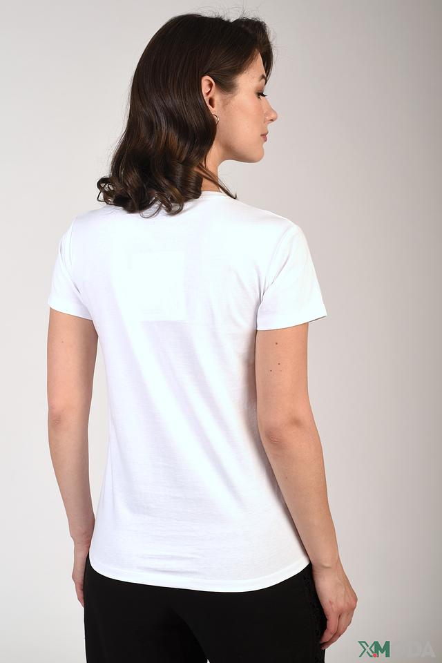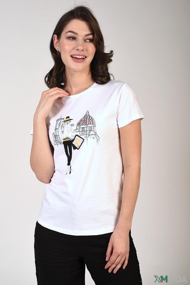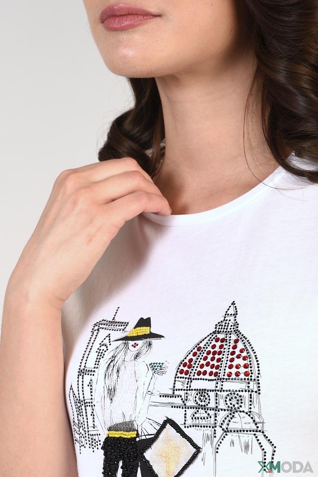 Основной цвет футболки – белый, что позволяет легко сочетать ее с различными элементами одежды. Главная особенность модели – яркий и запоминающийся принт, изображающий силуэт девушки на фоне архитектурных элементов.