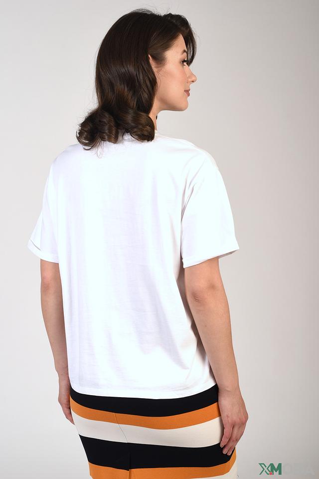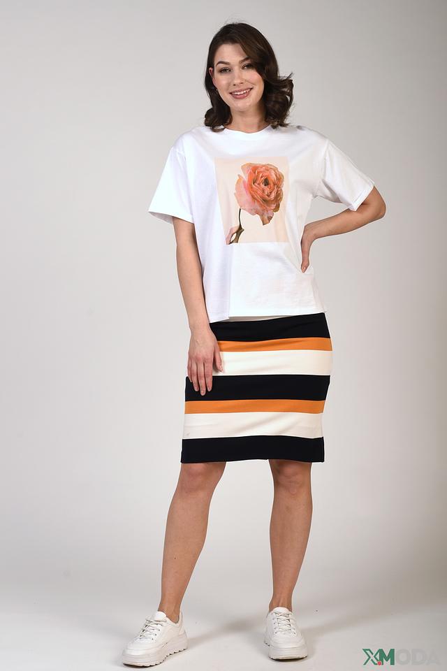 Фасон футболки – свободный, оверсайз, что делает ее универсальной и подходящей для разных типов фигур. Короткий рукав и классический круглый вырез горловины обеспечивают дополнительный комфорт. Эта футболка идеально сочетается с джинсами, шортами или юбками, создавая стильный и непринужденный образ.