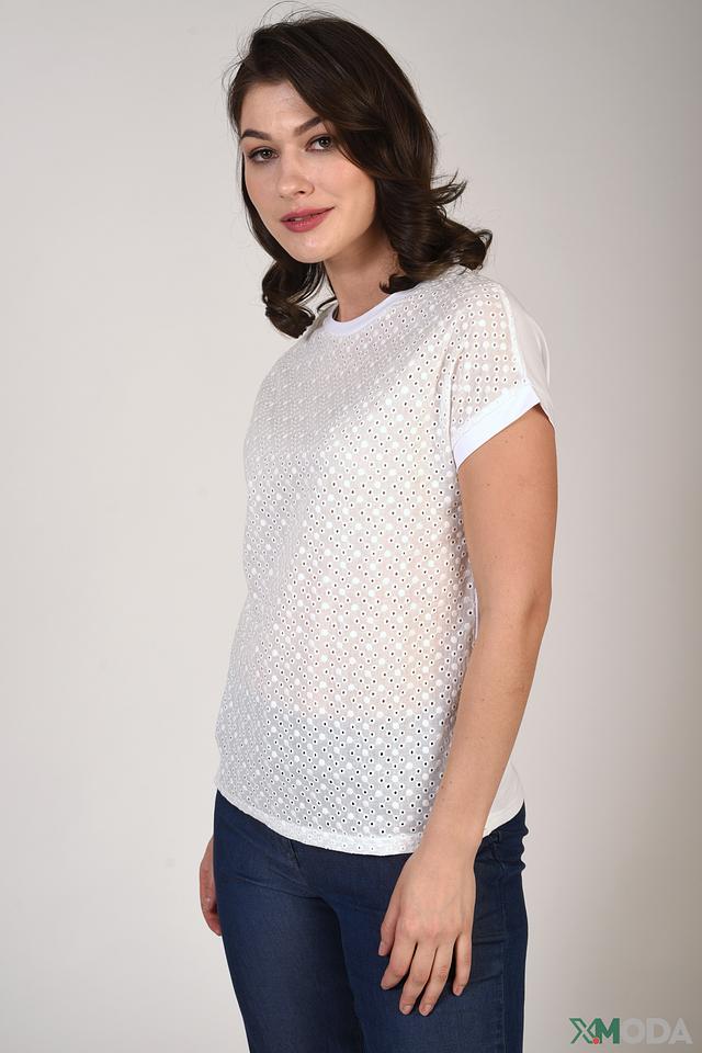 Блуза имеет прямой крой и короткие рукава с манжетами. Основной цвет – белый, а вся поверхность украшена изысканной ажурной вышивкой, придающей ей особый шарм и женственность.