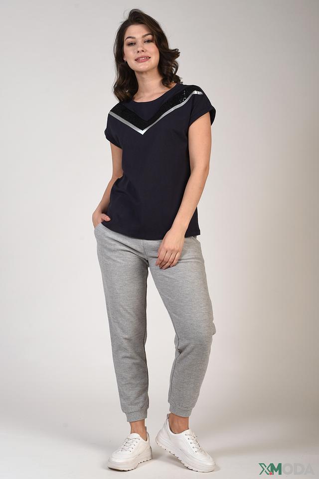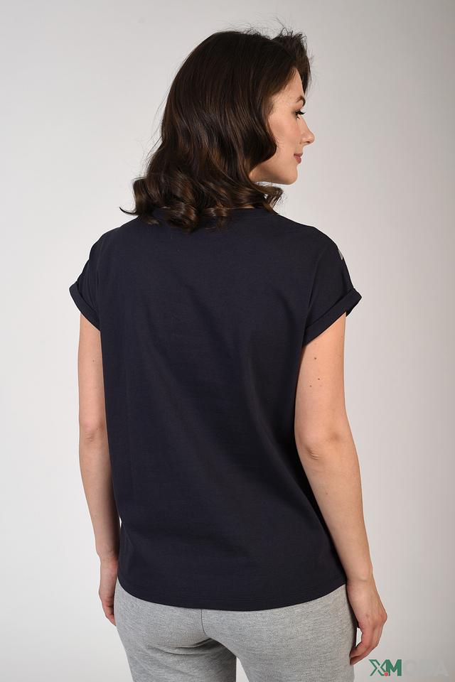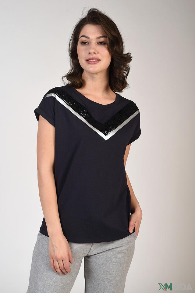 Особый акцент в этой модели – декоративная отделка из чёрных пайеток и серебристой вставки в форме V-образного выреза на груди. Этот элемент придает футболке праздничный и элегантный вид, делая её подходящей как для повседневной носки, так и для особых случаев.