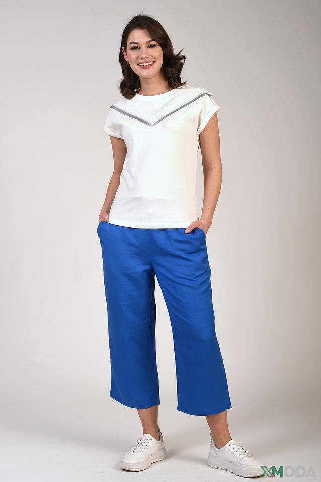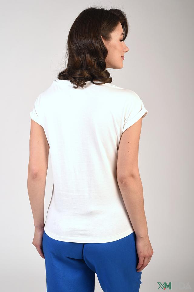 Особенностью данной модели является декоративная полоса из серебряной ткани, расположенная на вырезе горловины, что придает ей изысканность и оригинальность. Короткие рукава с аккуратными манжетами делают футболку удобной для повседневной носки.