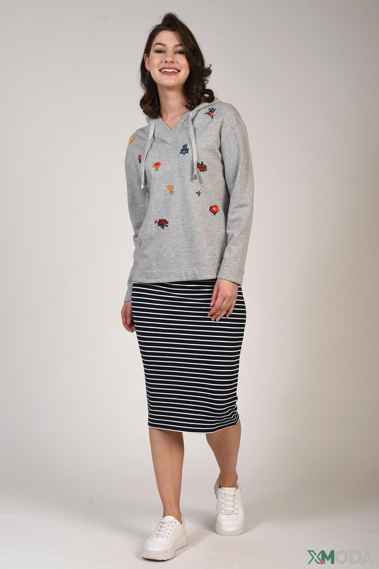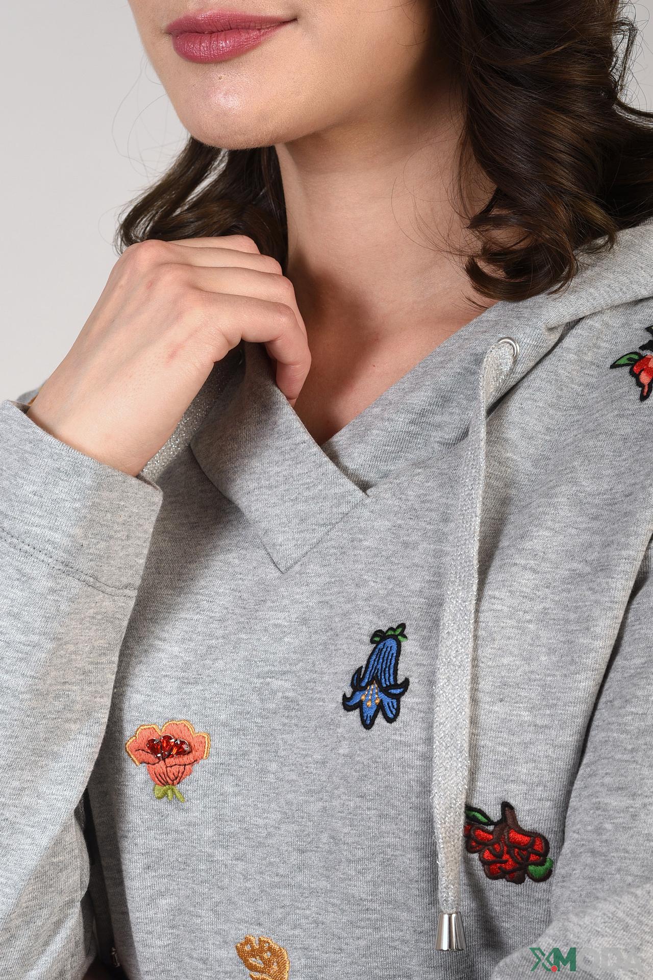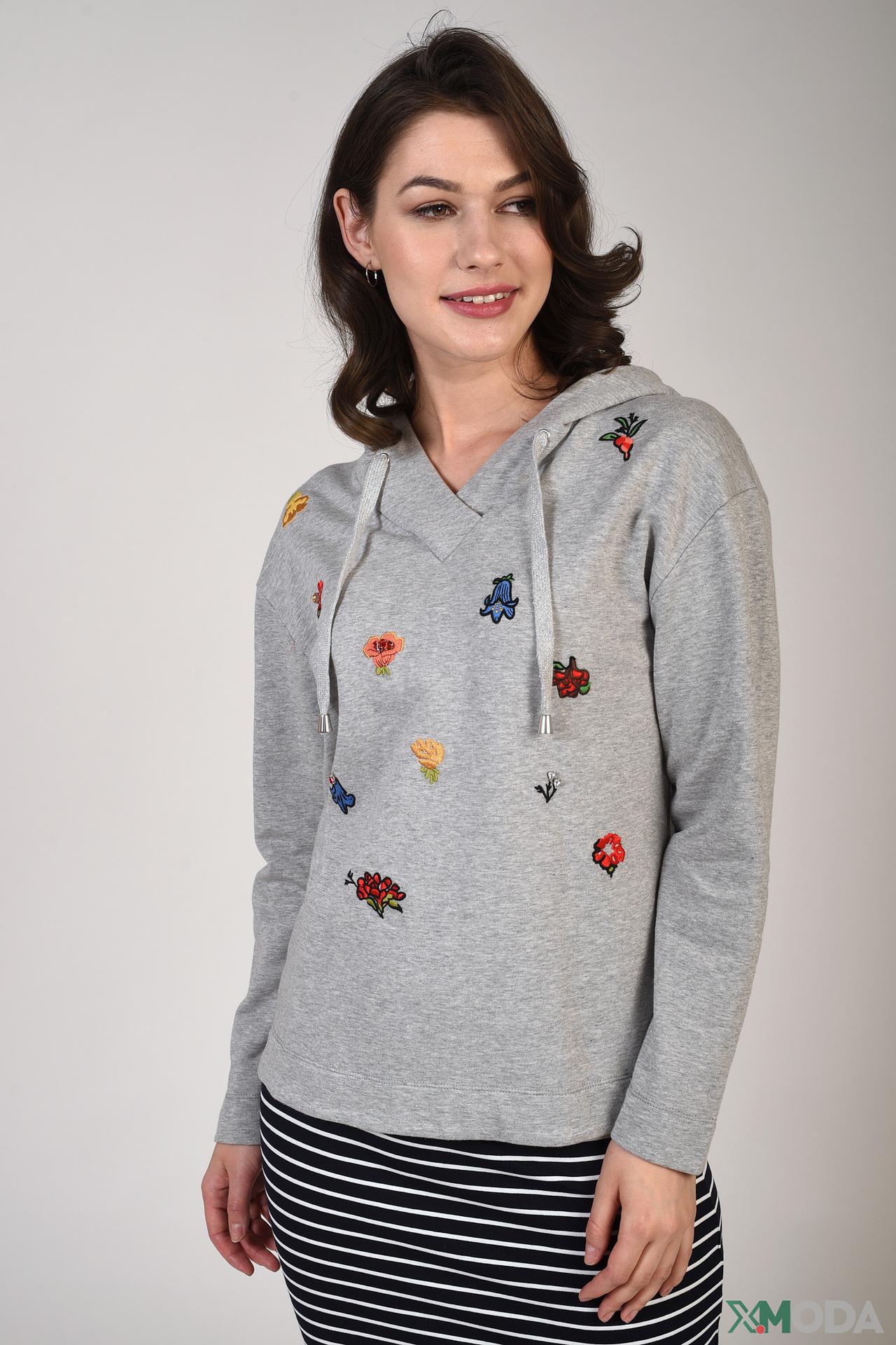 - Оригинальный дизайн: Пуловер украшен яркой и красочной вышивкой в виде цветов и бабочек, добавляя образу индивидуальности и игривости.