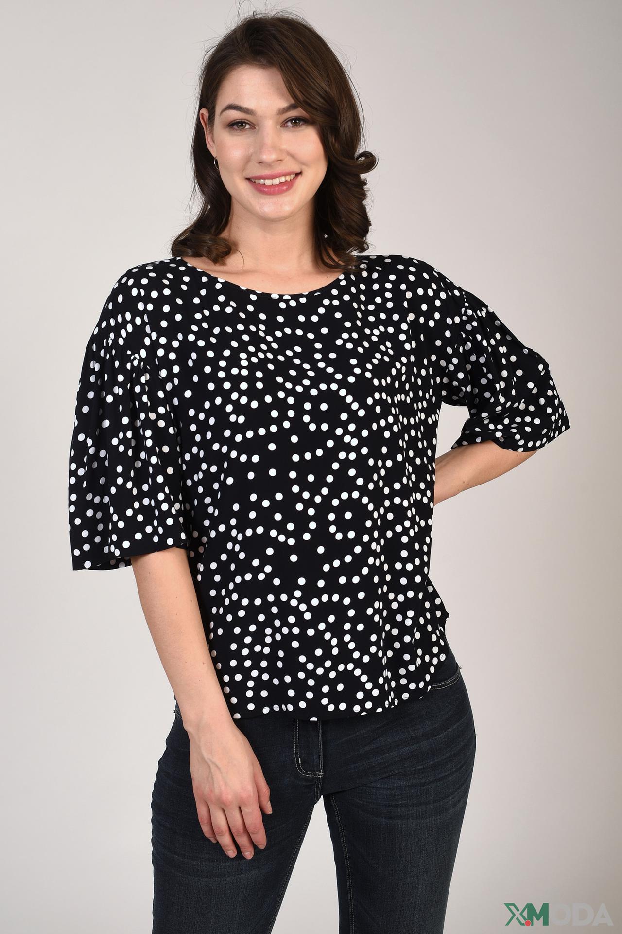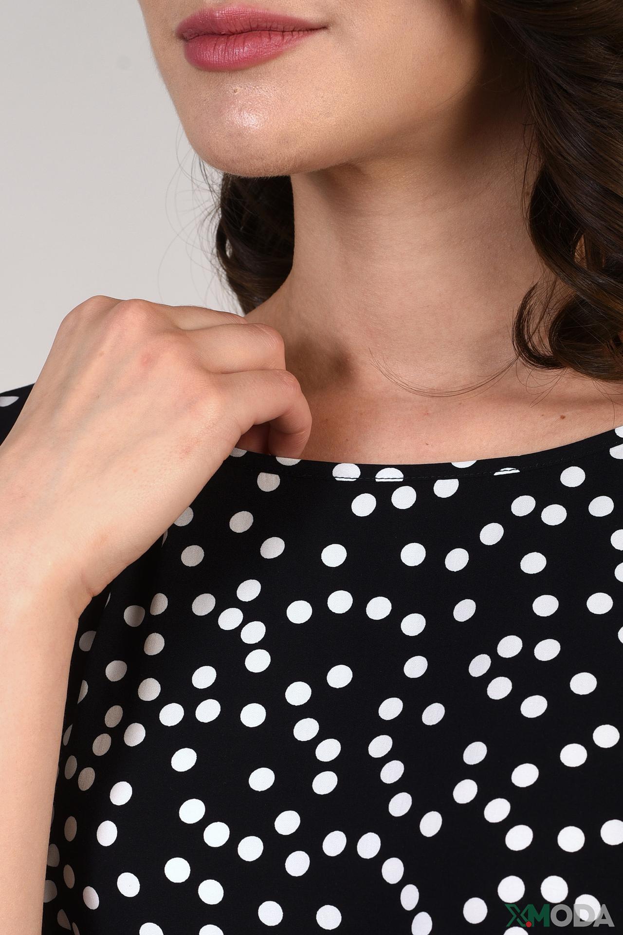 - Дизайн: Модель имеет свободный крой и оригинальный принт в мелкий белый горошек на черном фоне. Рукава ¾ придают изделию легкость и изящество.