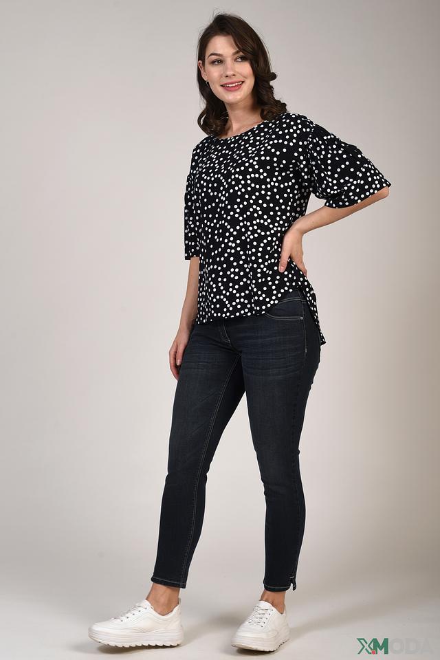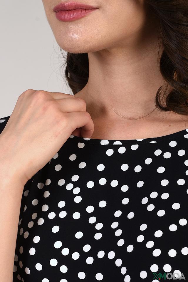 Блуза имеет классический чёрный цвет с мелким белым горошком, который придаёт ей игривый и женственный вид. Свободный крой не сковывает движения, а короткие рукава делают её идеальной для тёплой погоды.
