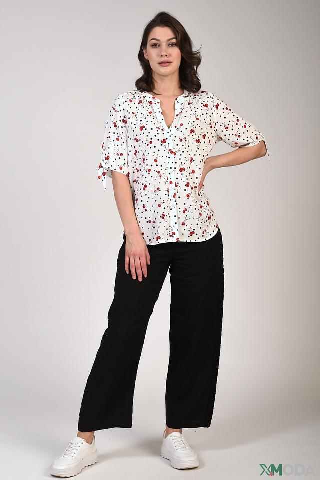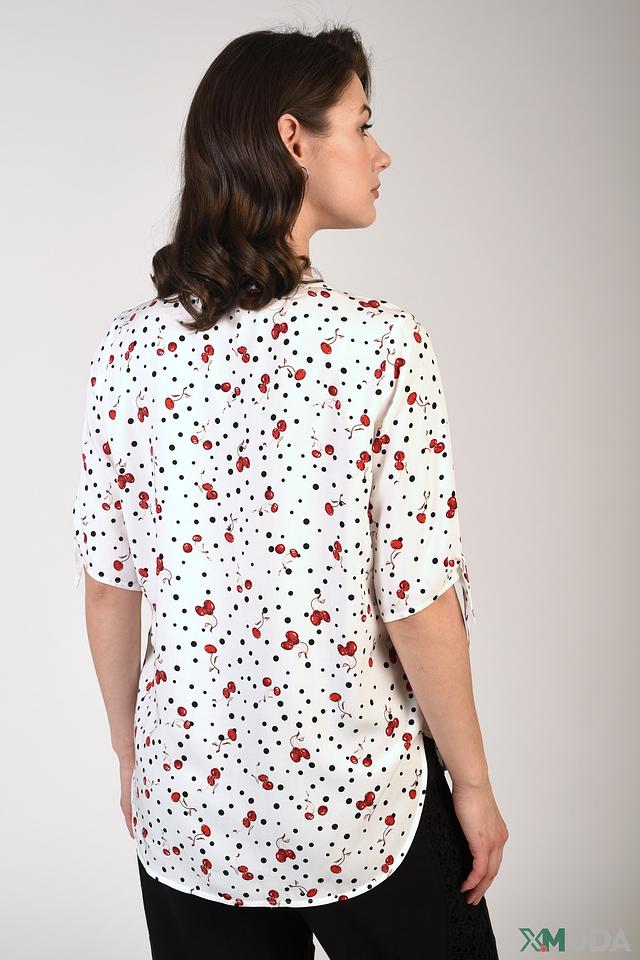 Блуза имеет свободный крой, V-образный вырез и короткие рукава с манжетами. Особенностью модели является яркий принт с изображением вишен, который добавляет игривости и свежести образу.