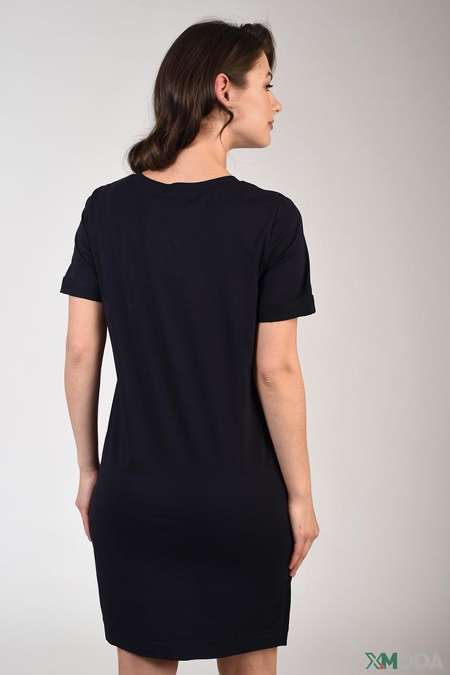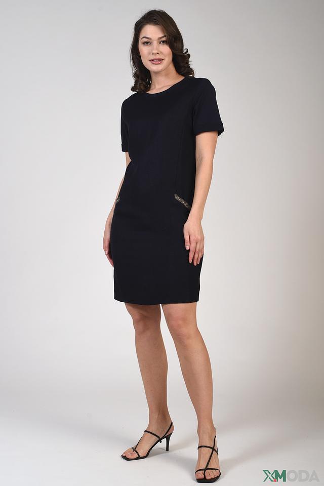 Модель имеет приталенный силуэт, который подчеркивает фигуру, и короткие рукава, обеспечивающие комфорт в теплую погоду. На передней части платья расположены декоративные карманы, которые придают ему особый шарм и функциональность.