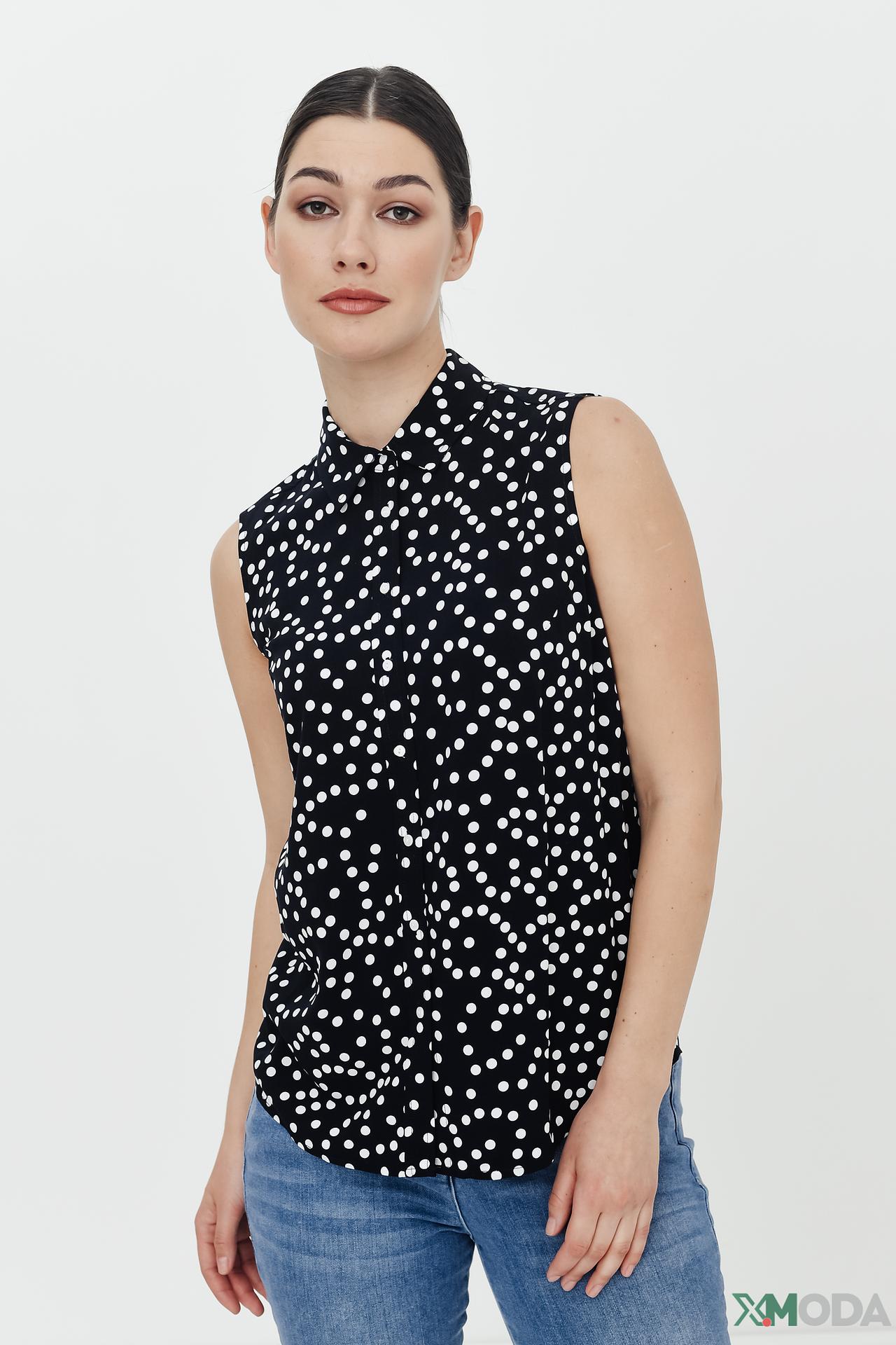 - Дизайн: Блуза имеет классический воротник-стойку и застежку на пуговицы по всей длине. Отсутствие рукавов подчеркивает изящность линий и дарит свободу движений. Принт в горошек добавляет образу динамичности и шарма.