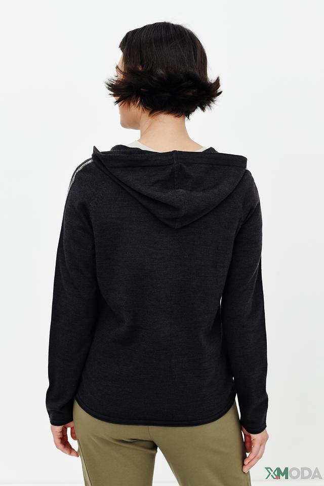 Чёрная женская толстовка Pezzo на молнии с декоративной полоской по рукавам. Модель выполнена из мягкого трикотажа с добавлением шерсти, что обеспечивает комфорт и тепло. Состав: акрил 45%, шерсть 45%, полиамид 10%