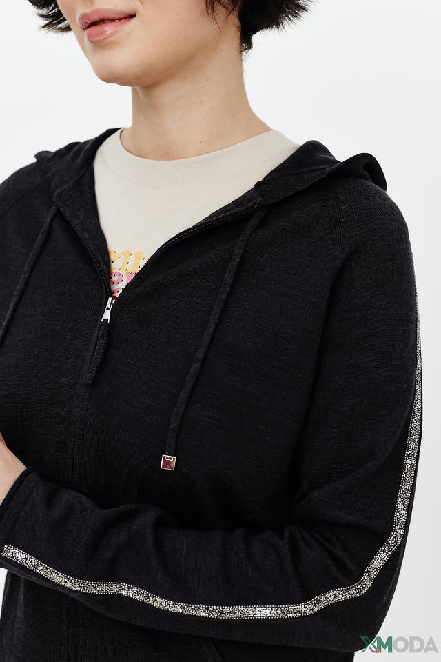Толстовка имеет удобную молнию, капюшон и карманы. Декоративная полоска с блестящими нитями на рукавах придает образу изысканность и оригинальность.
