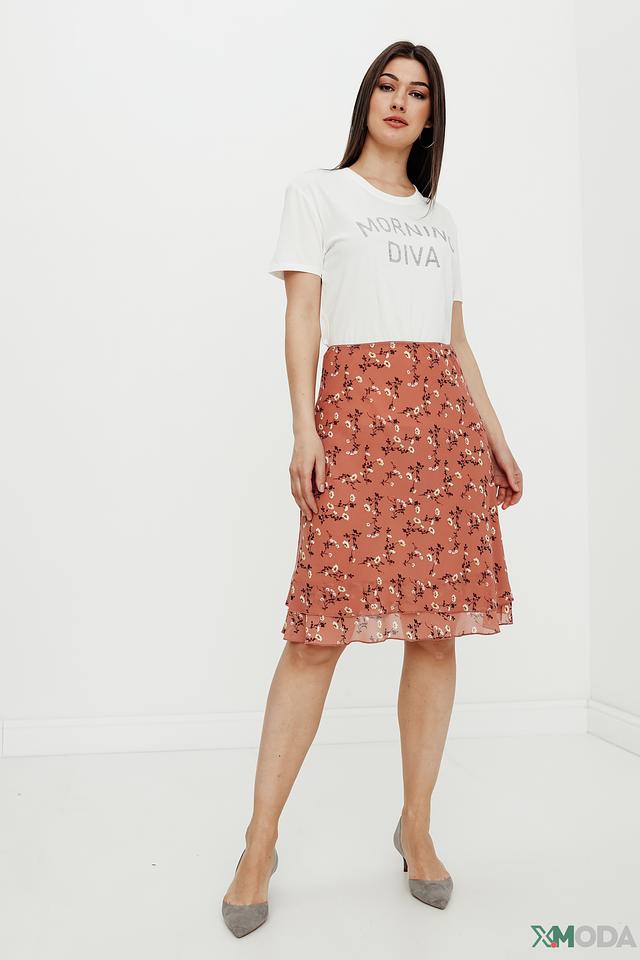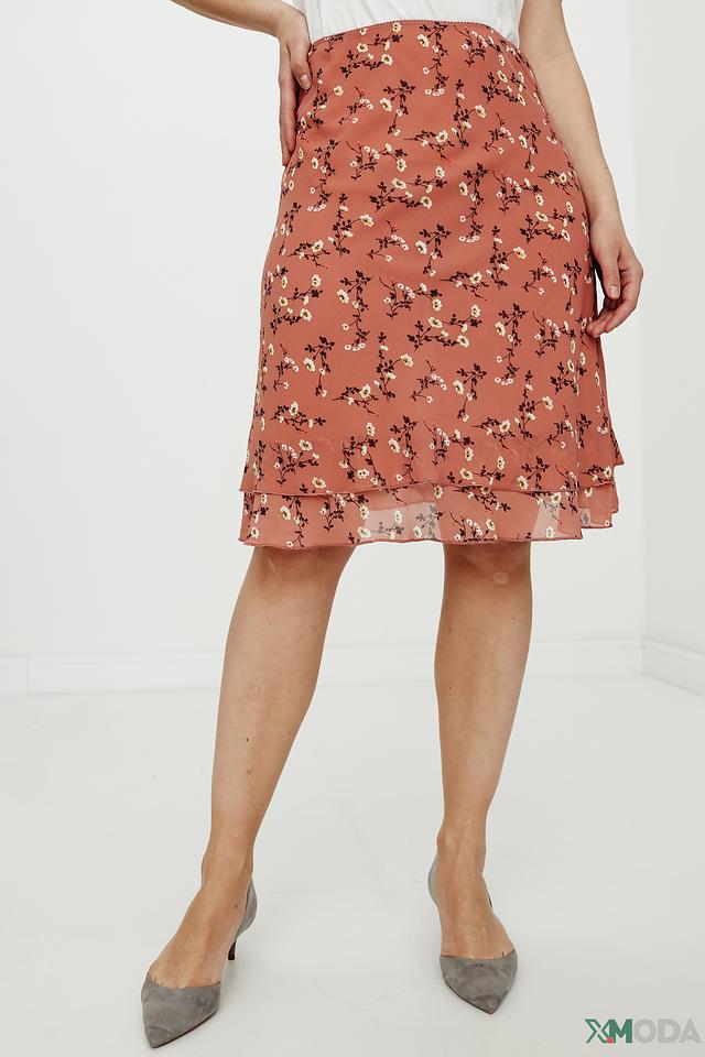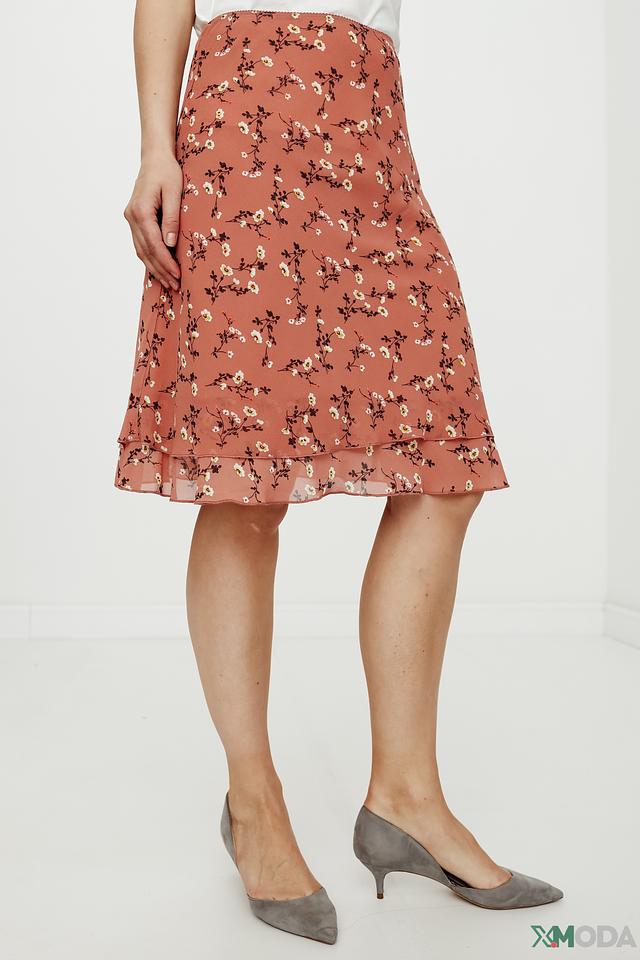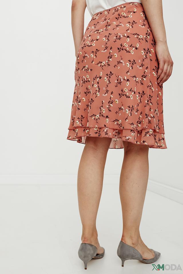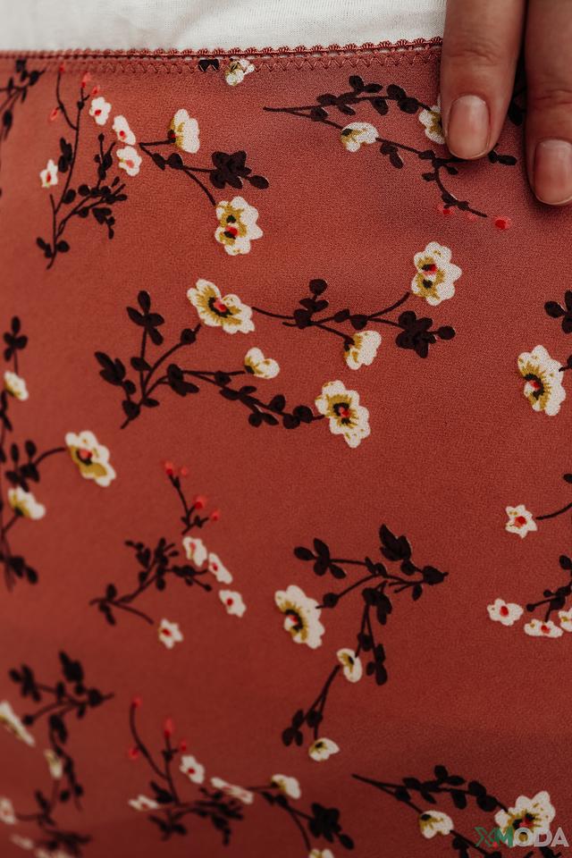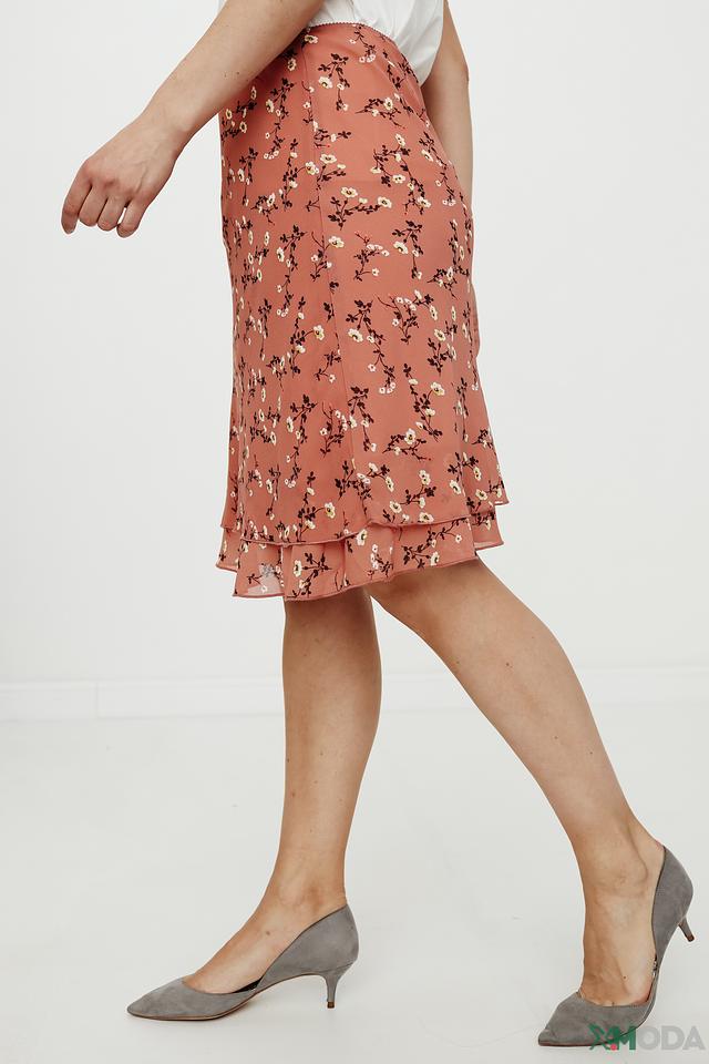 Юбка имеет приятный терракотовый цвет, украшенный мелким цветочным принтом, что придает ей романтичное настроение. Многослойный дизайн юбки создает дополнительный объем и динамику.